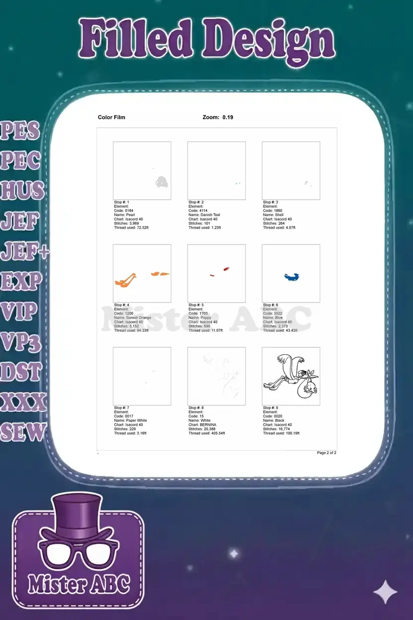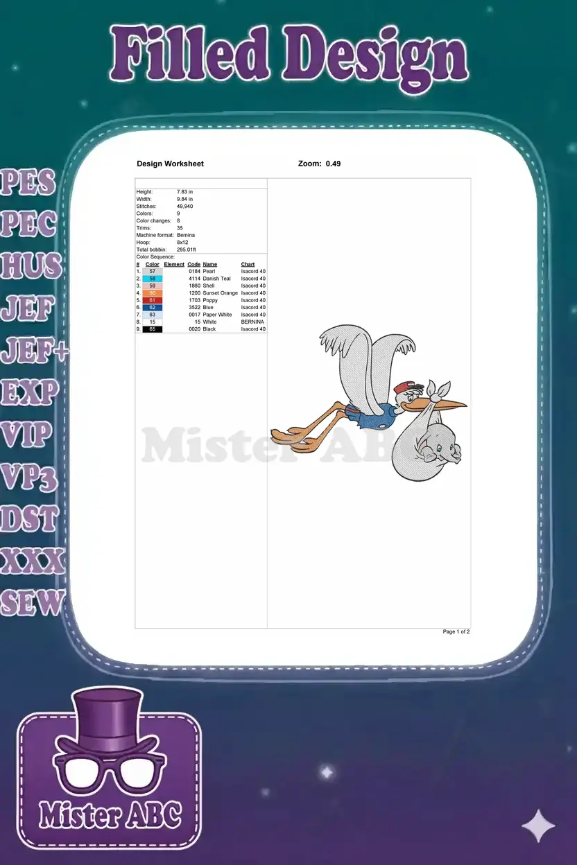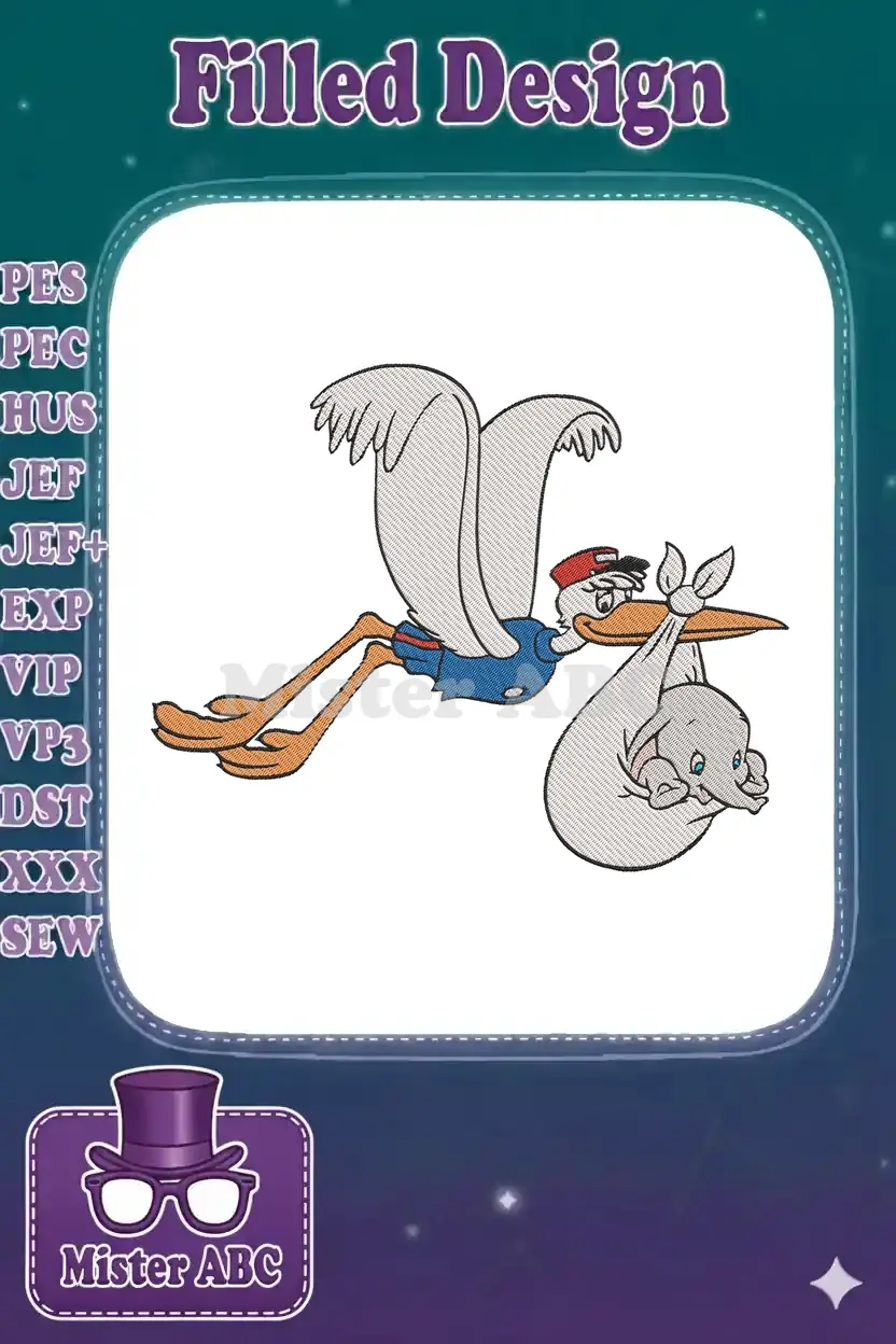 Charming Dumbo and Stork embroidery design, perfect for baby items. Celebrate new arrivals with this adorable, detailed pattern.