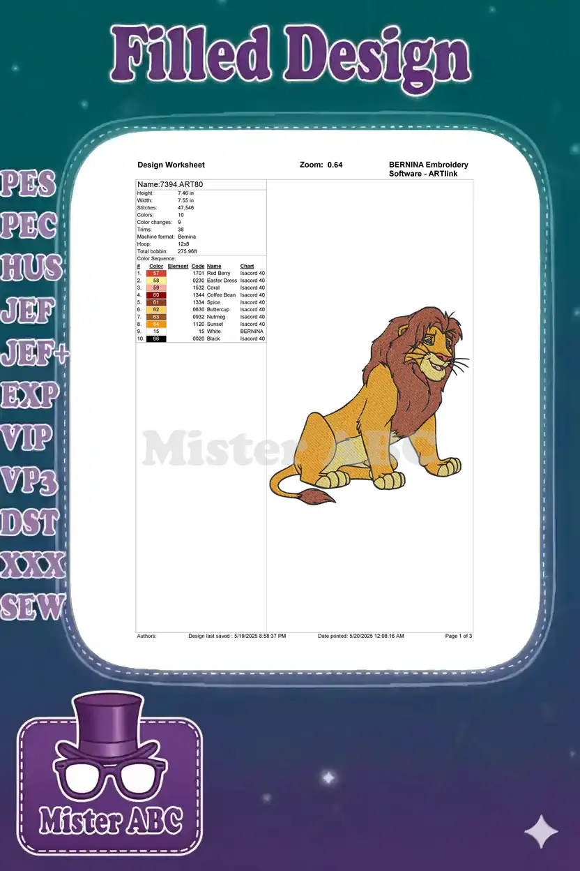 Friendly Cartoon Lion Sitting Embroidery Designs for Kids Apparel