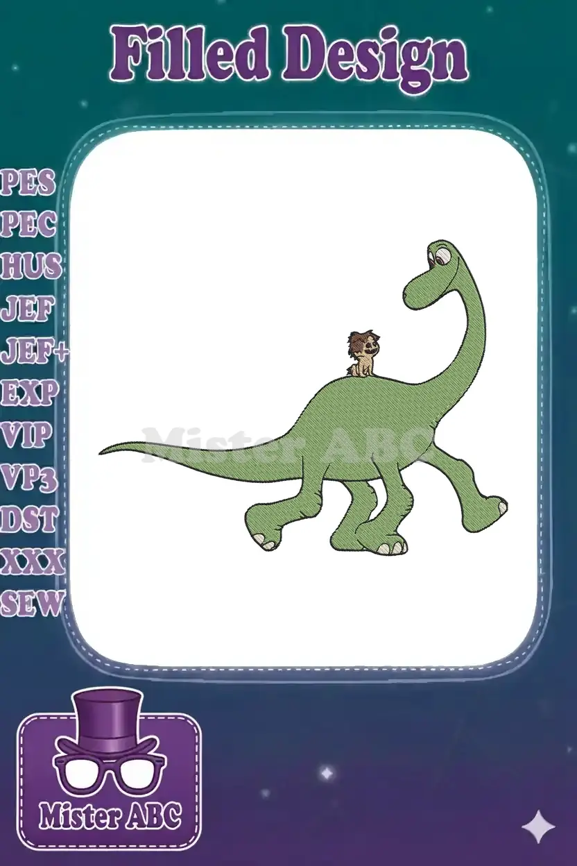 Friendly green dinosaur with furry companion embroidery designs