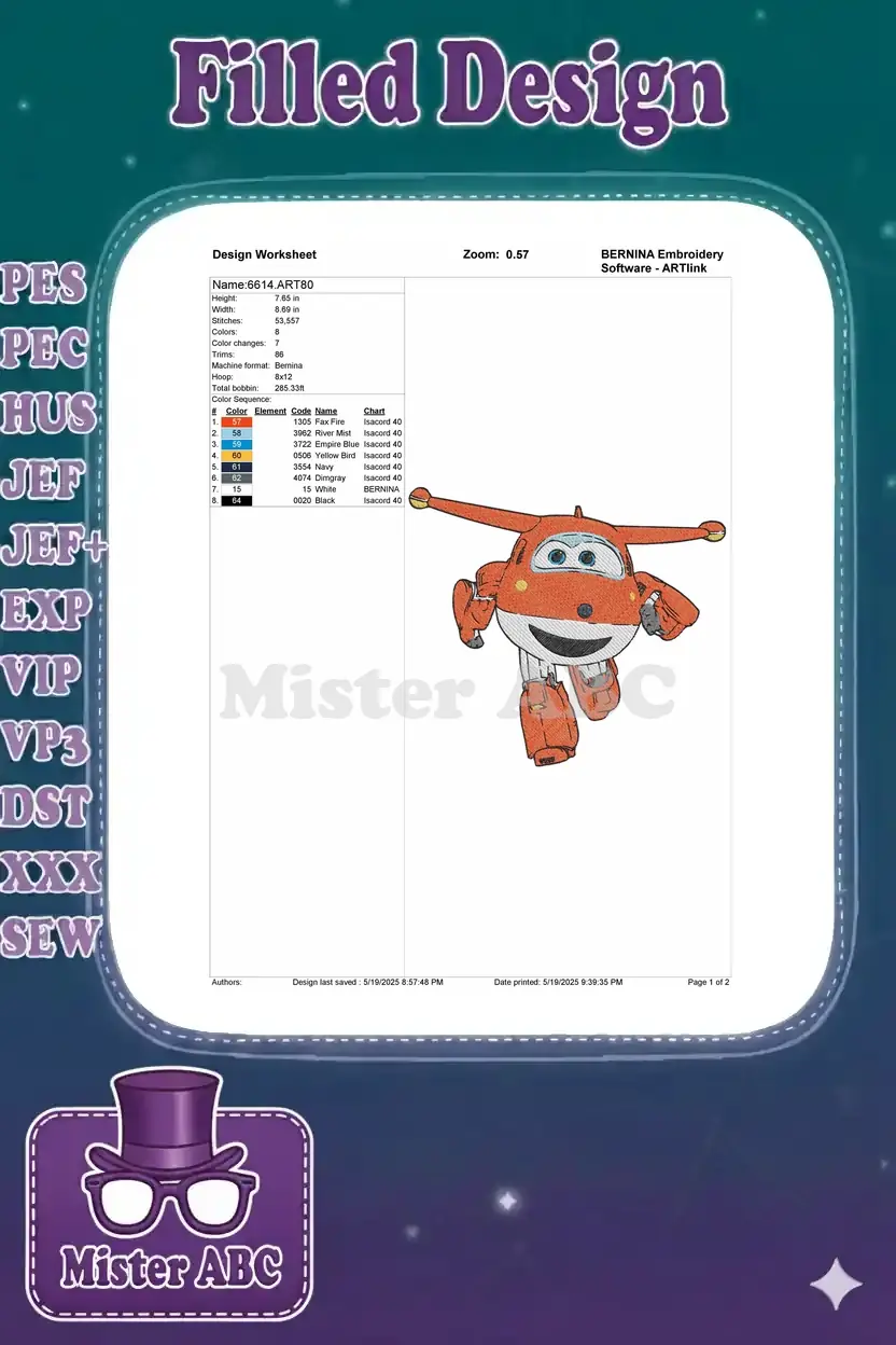 Soar into fun with this vibrant Jett Super Wings embroidery design! Perfect for adding a touch of adventure to any item.