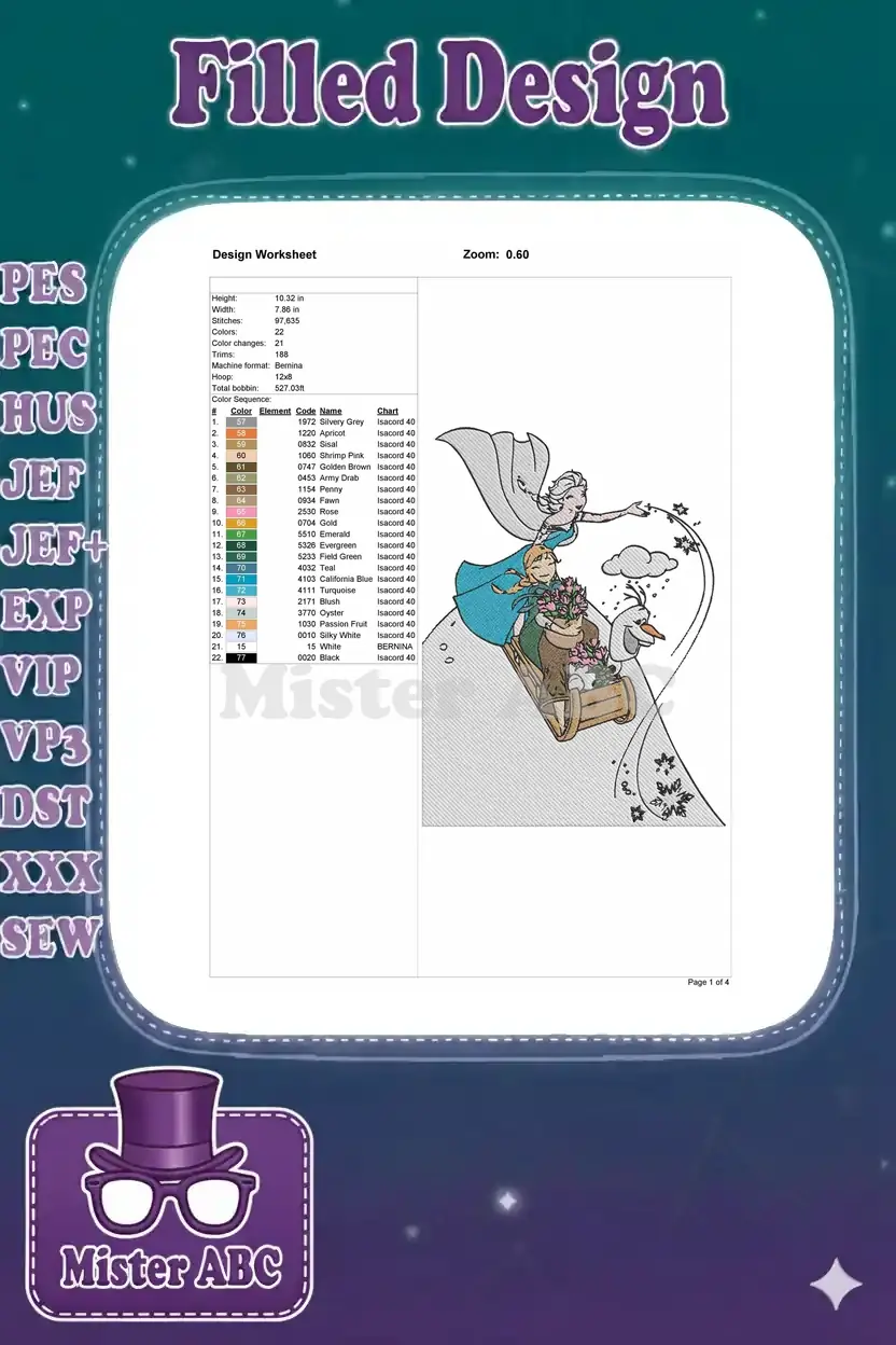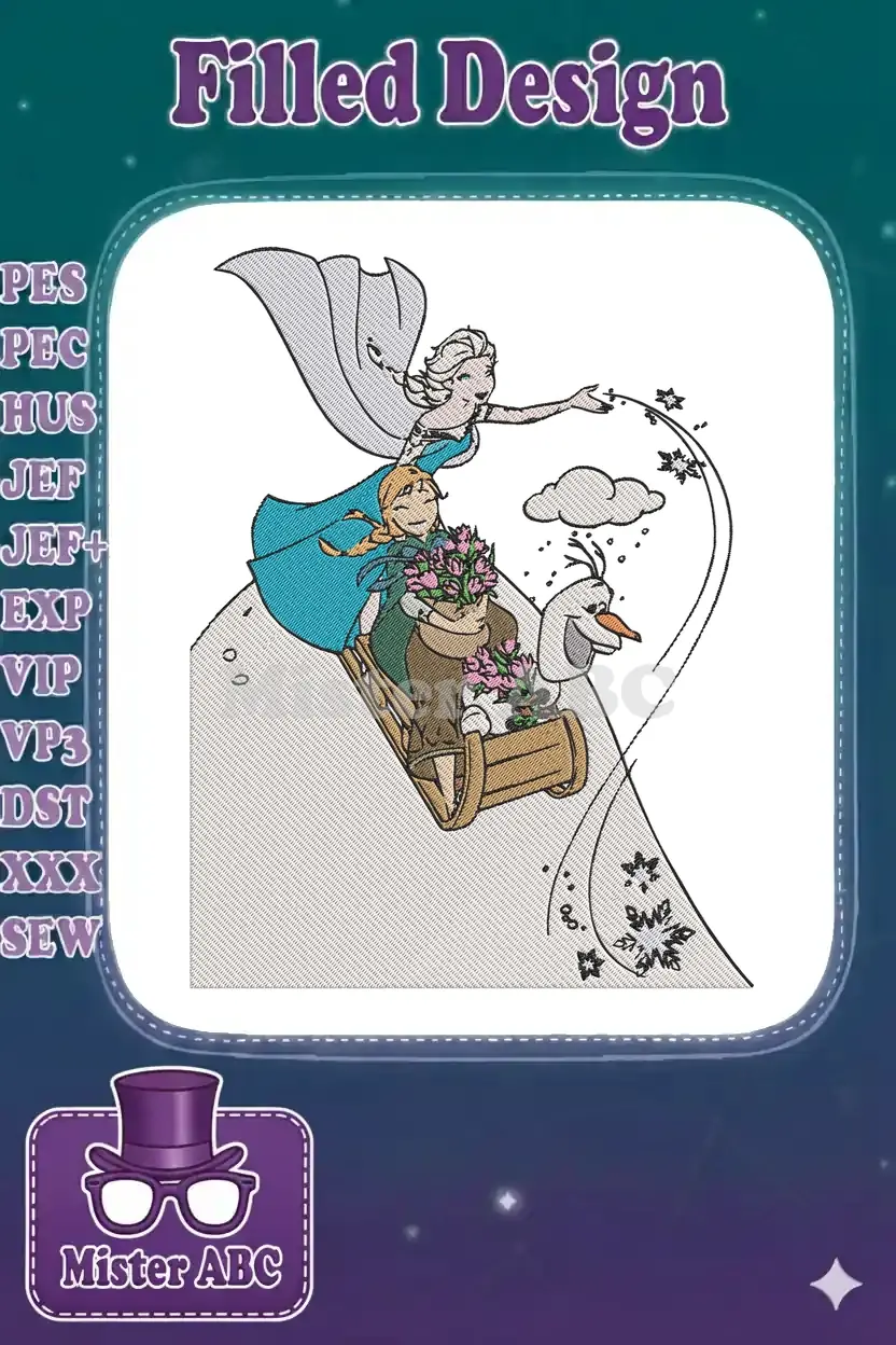 Whimsical Frozen embroidery featuring Elsa, Anna, and Olaf on a snowy sleigh ride, perfect for fans! Bring Disney magic to life with this enchanting design.