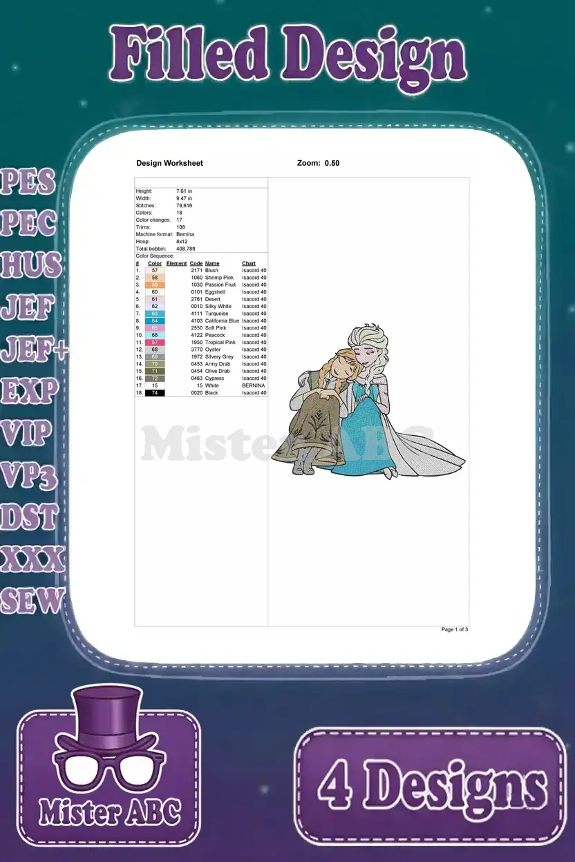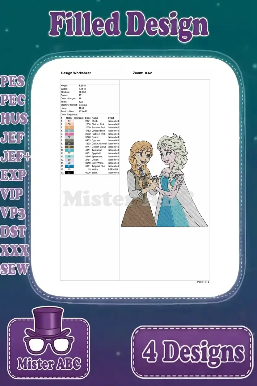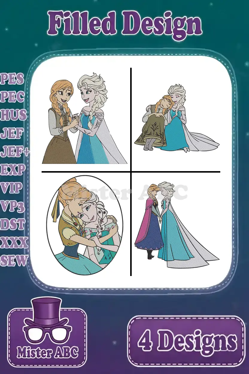 Embrace the magic with this exquisite embroidery design bundle featuring Anna and Elsa in four heartwarming poses. Perfect for Disney fans!