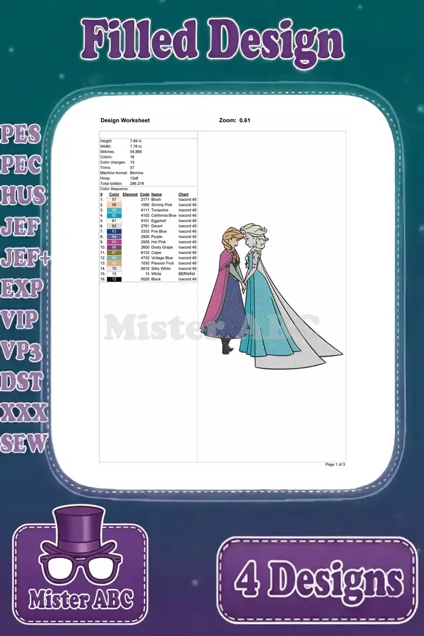 Frozen Elsa And Anna Sisterly Portraits Oval Frames And Full Body Poses - Filled Embroidery Design - 3058