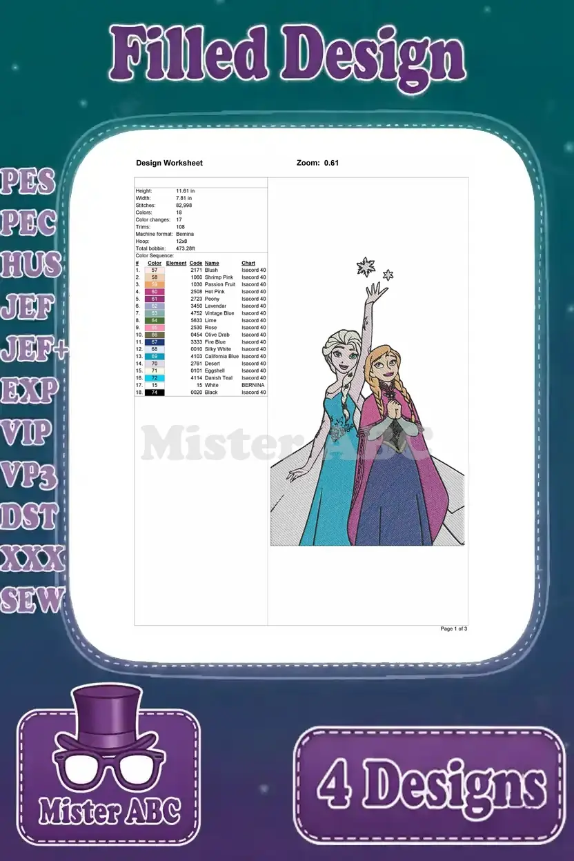 Bring the magic of Arendelle to life with this enchanting bundle of four filled embroidery designs featuring Elsa and Anna!