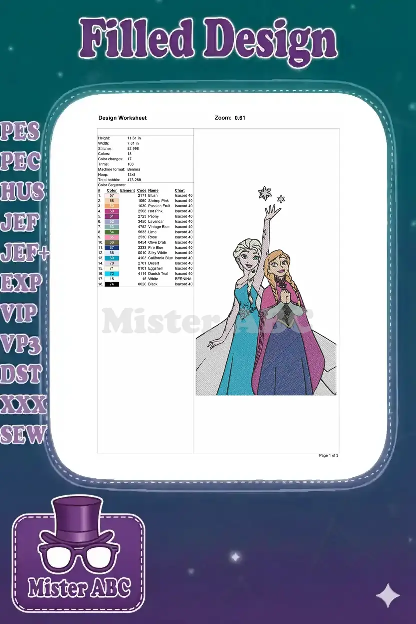 Bring the magic of Arendelle to life with this enchanting embroidery design featuring sisters Elsa and Anna, creating snowflakes.