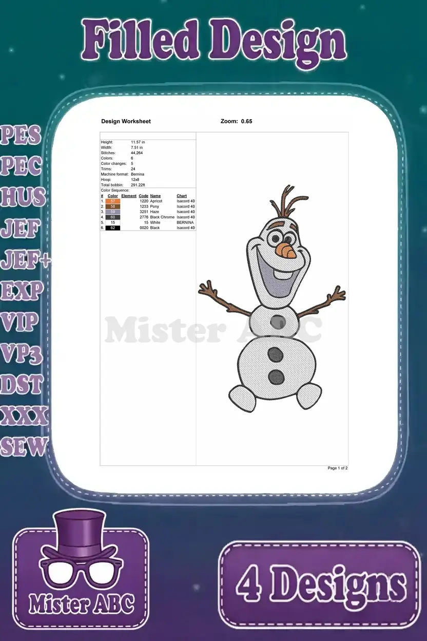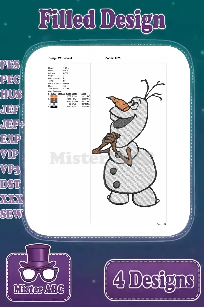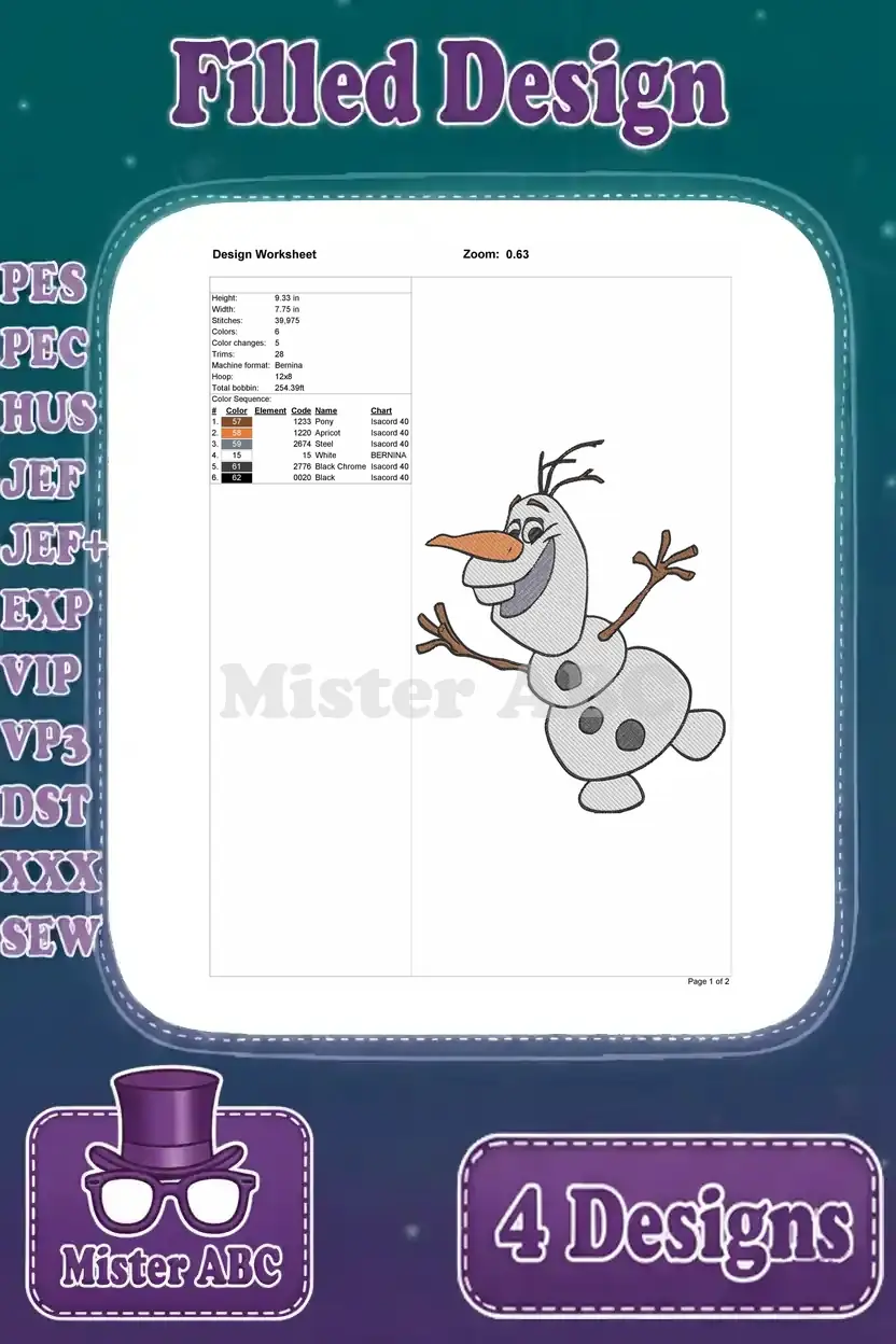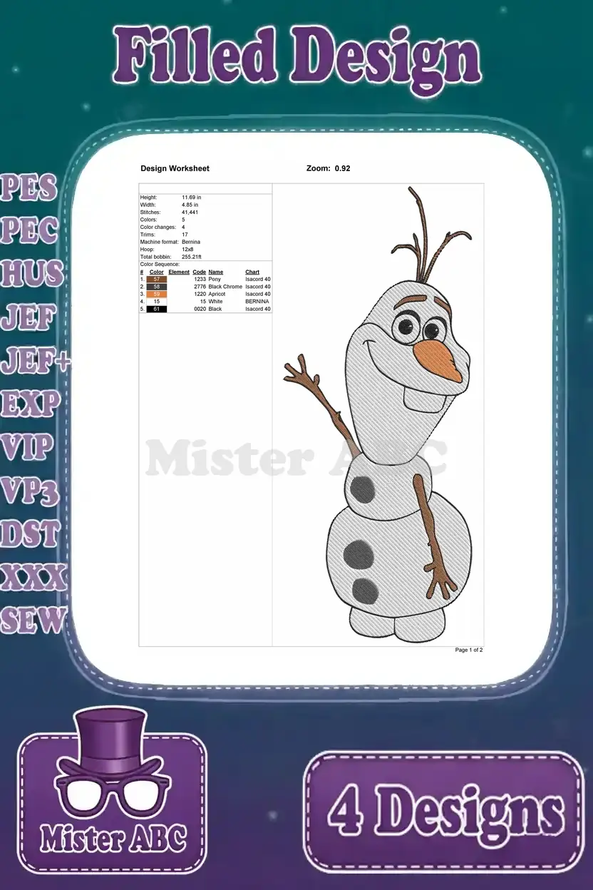 Delightful Olaf embroidery bundle featuring four unique filled designs, perfect for adding Frozen magic to any project. Bring joy to fabrics!