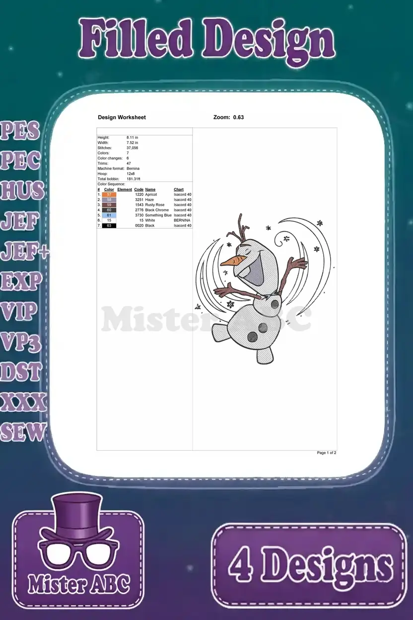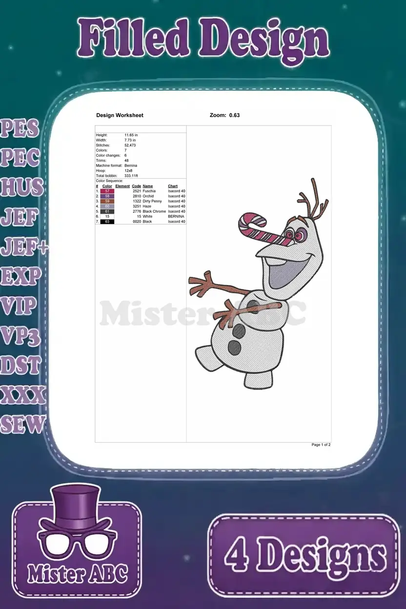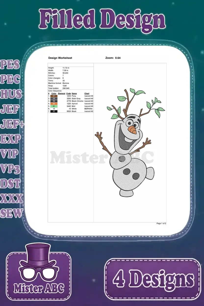 Delightful Olaf embroidery bundle featuring four unique filled designs from Frozen, perfect for fans. Add whimsical charm to any project.