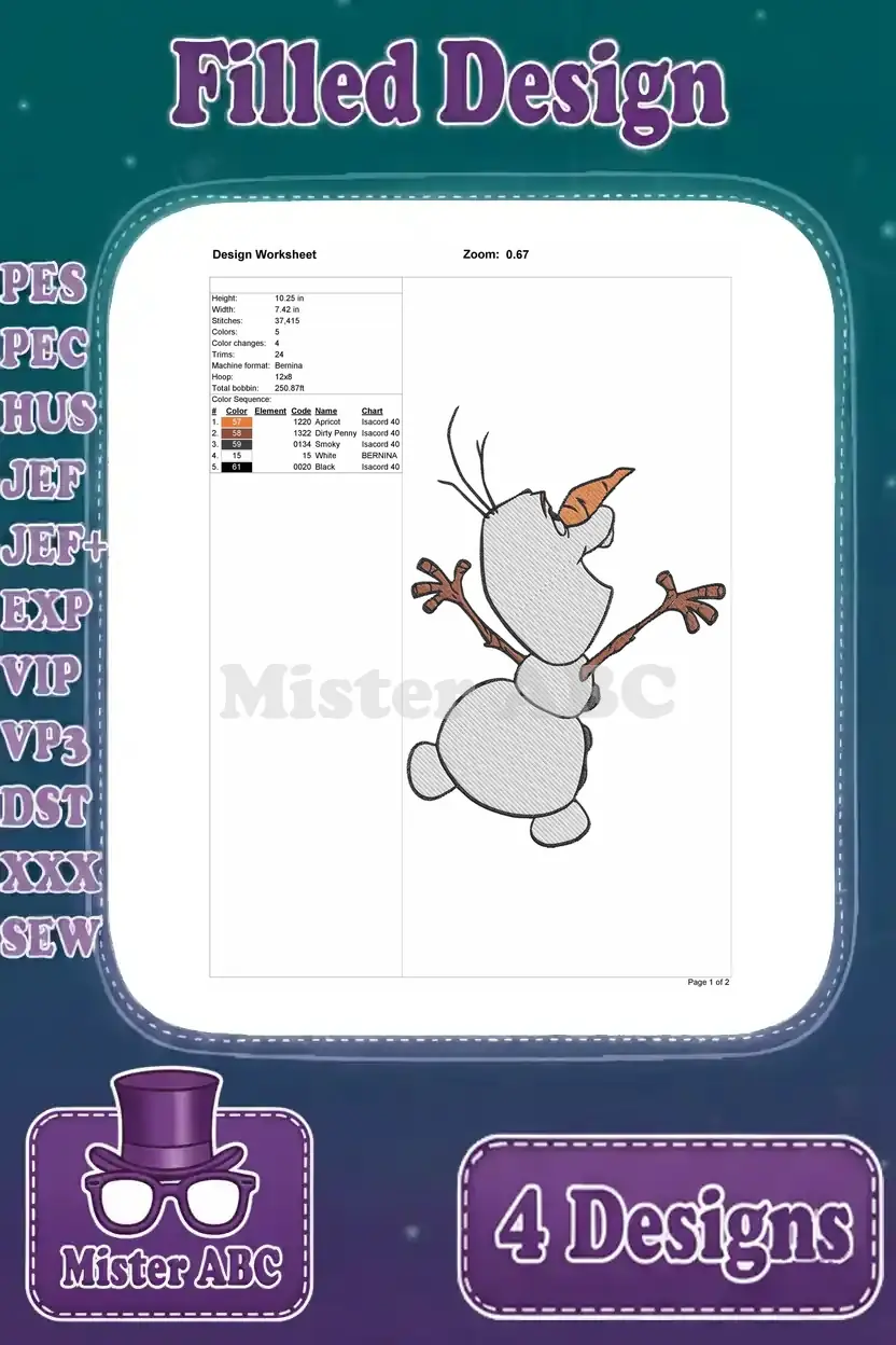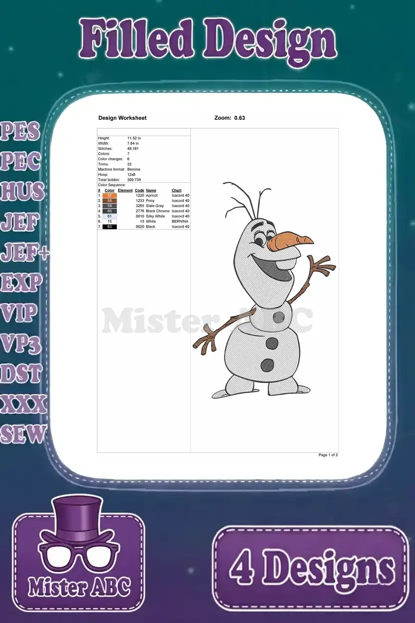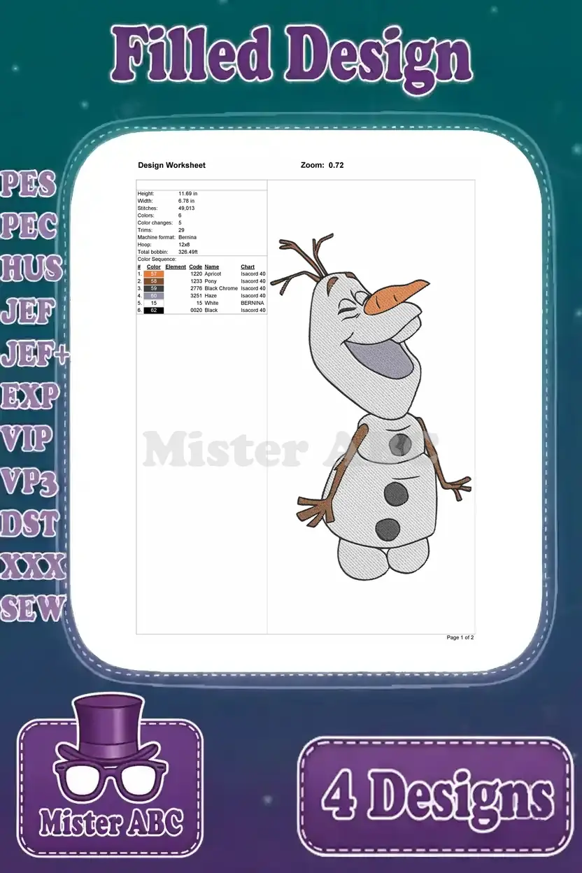 Embark on a Frozen adventure! This bundle features four delightful Olaf embroidery designs, perfect for adding charm.