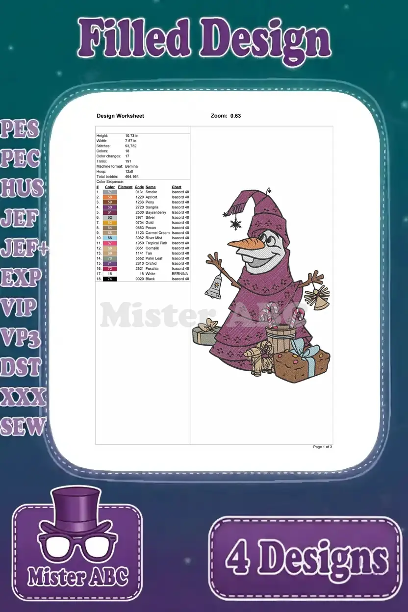 Frozen Olaf Snowman Various Poses Including Juggling Head And Wizard Costume – Filled Embroidery Design