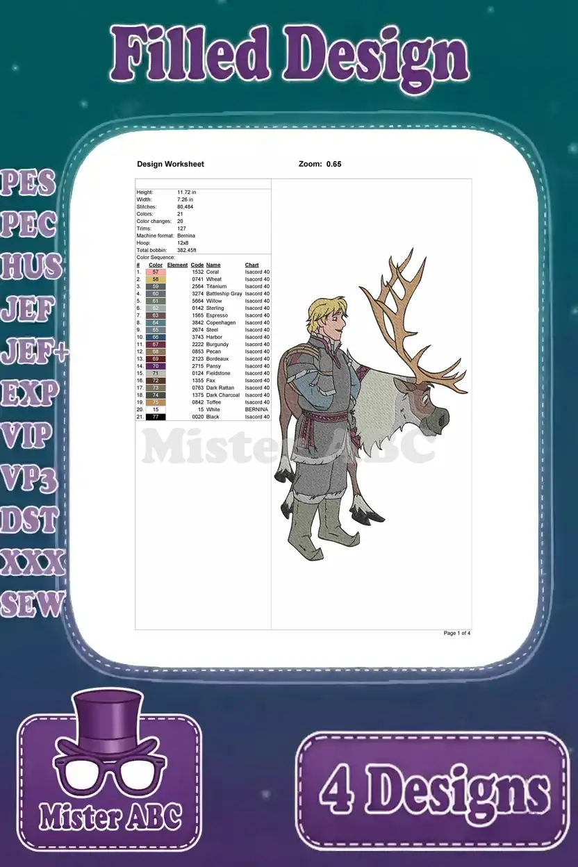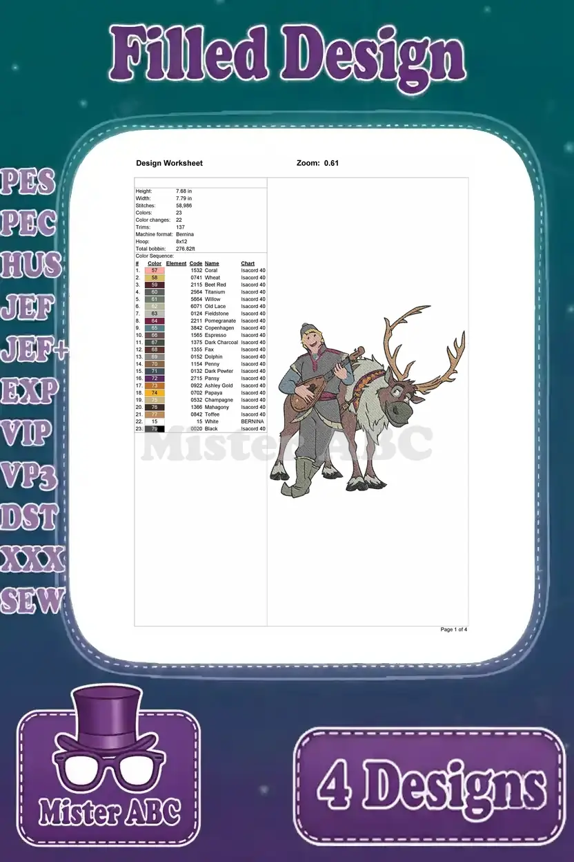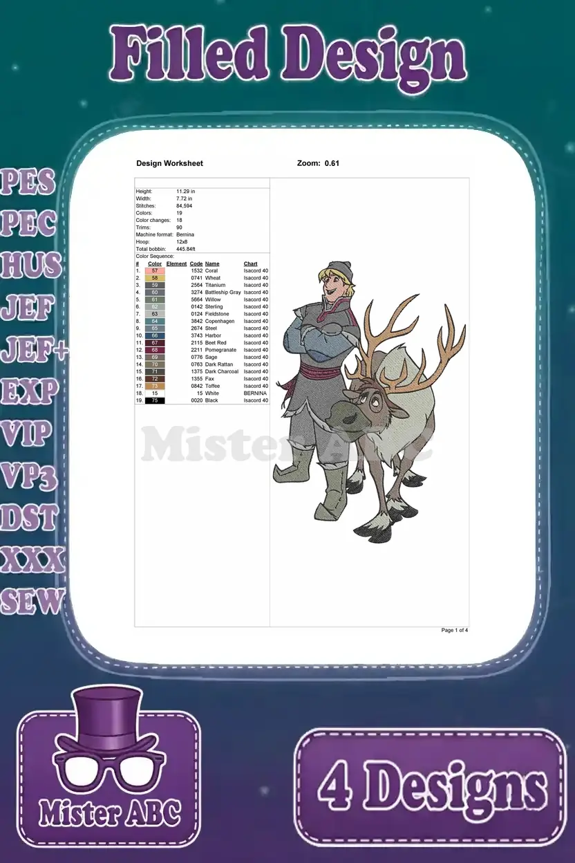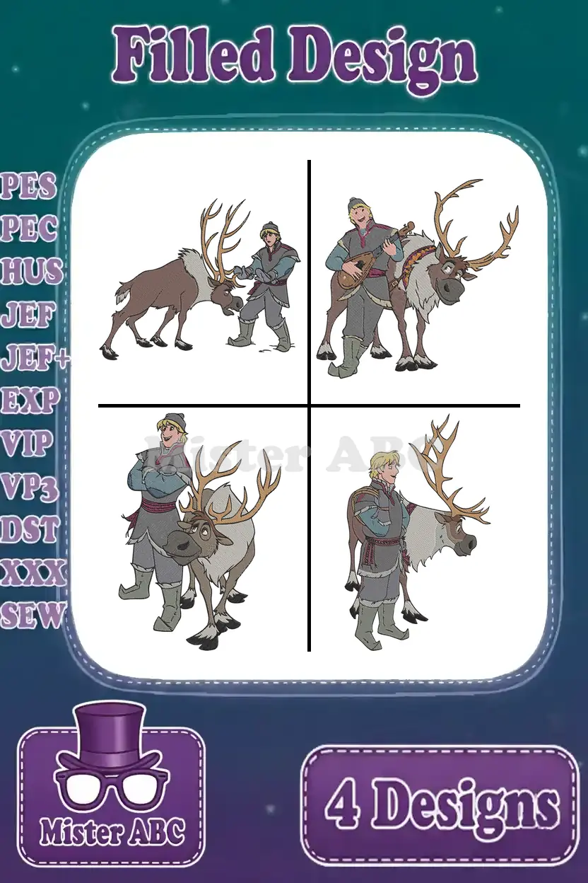 Frozen Sven Reindeer And Kristoff Ice Harvester Team Various Poses Together – Filled Embroidery Design