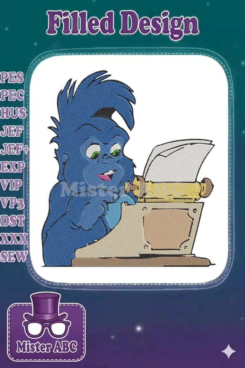 Funny blue cartoon gorilla typing on a vintage typewriter embroidery designs – Instant Download