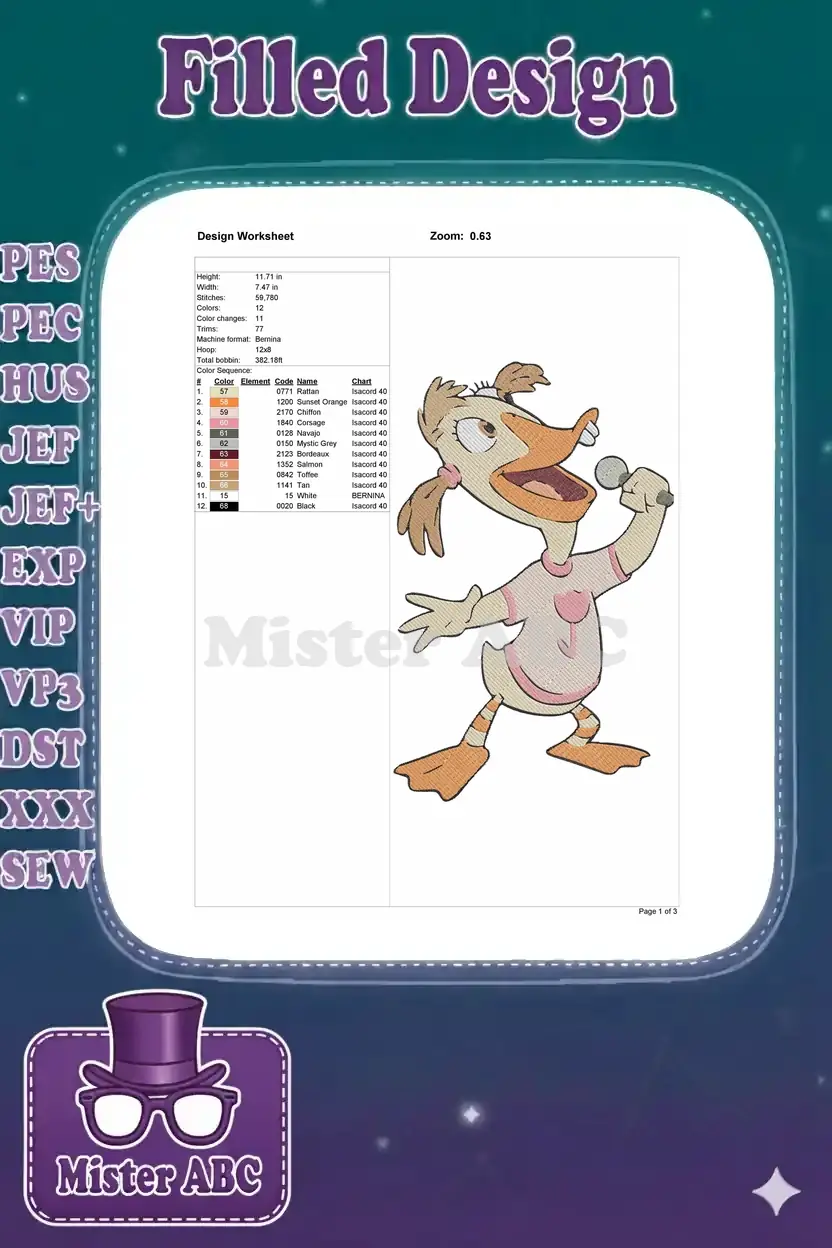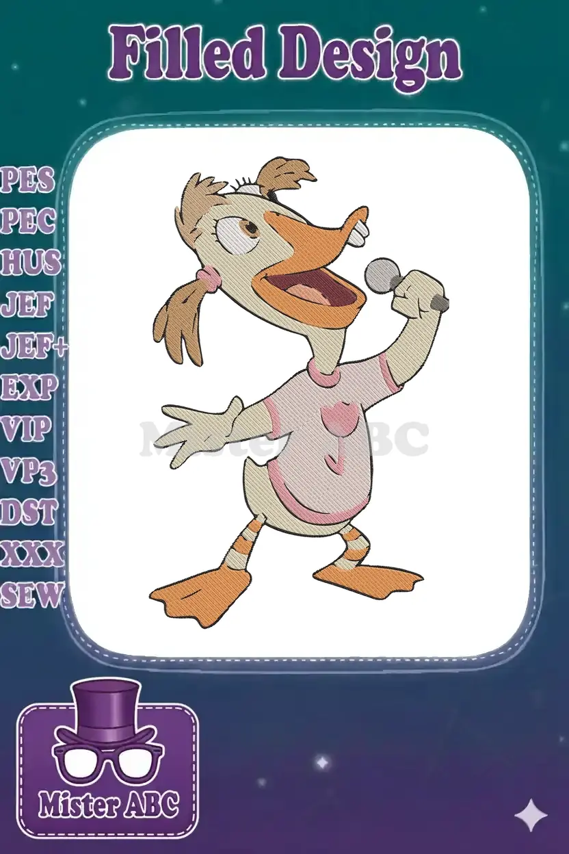 Funny cartoon duck singer with microphone embroidery designs