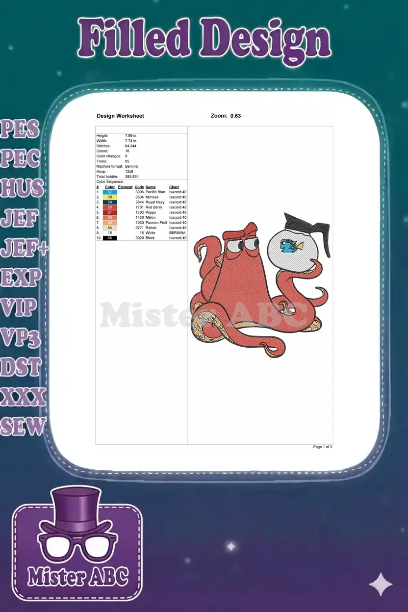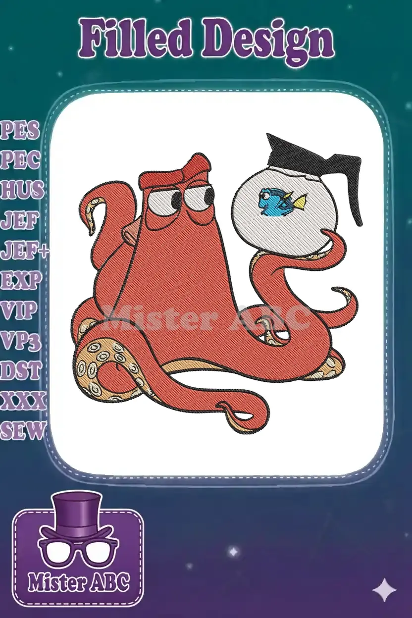 An adorable embroidery design featuring Hank the octopus holding Dory in a coffee pot, perfect for fans of Finding Dory and unique aquatic themes!