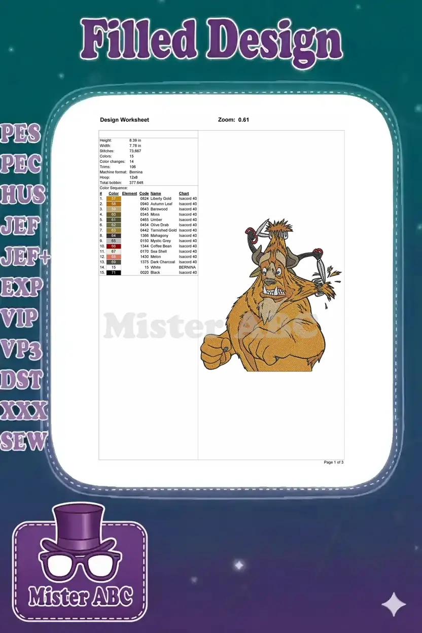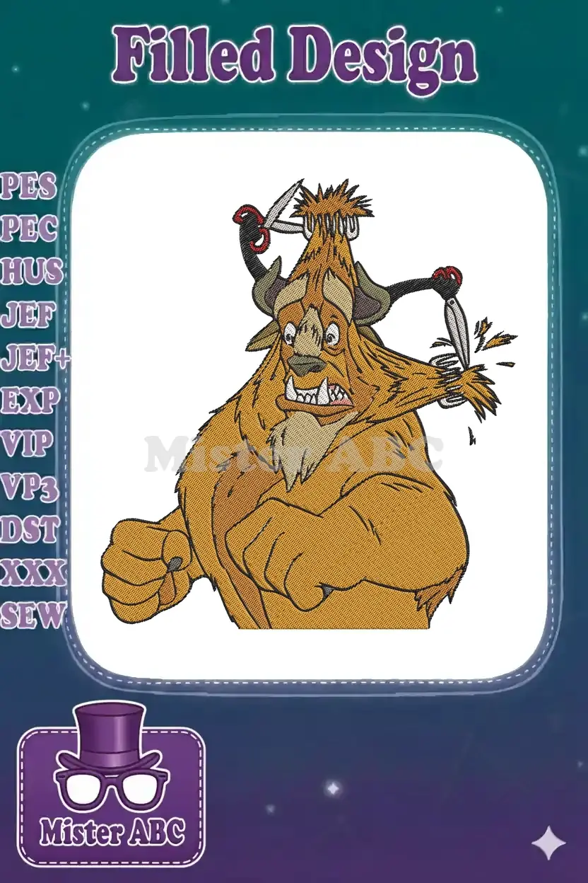 Embroider a hilarious scene of Beast getting a comically bad haircut, perfect for Disney fans and fun projects! Add a touch of humor.