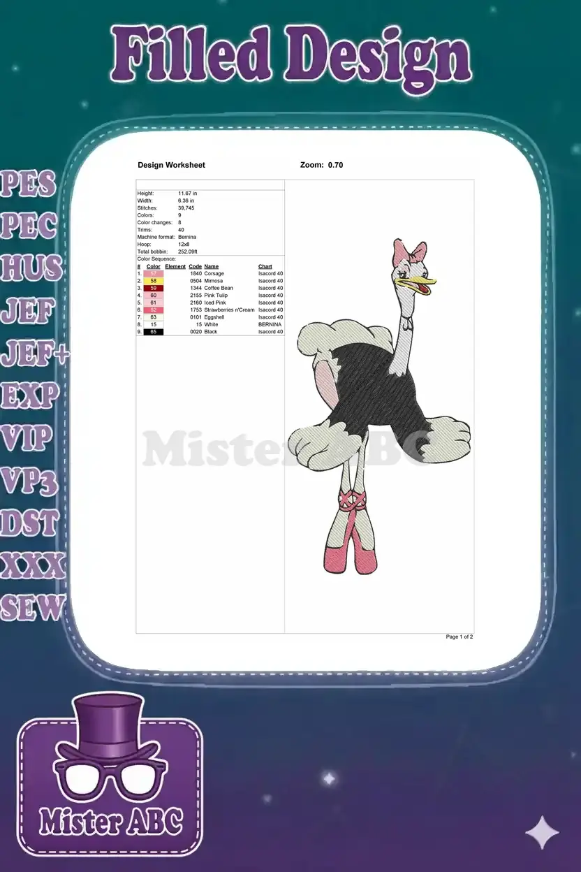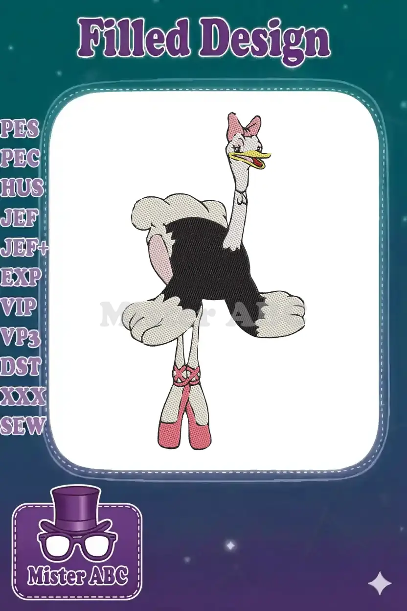 Funny Ostrich Ballerina with Pink Bow Embroidery Designs