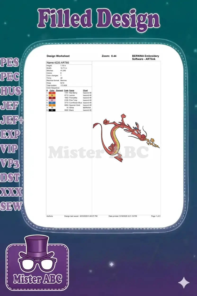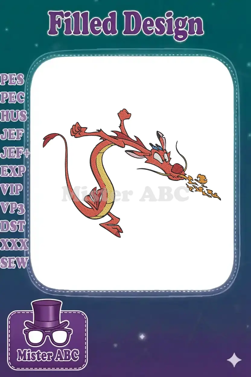 Funny red yellow dragon Mushu fire breathing embroidery designs