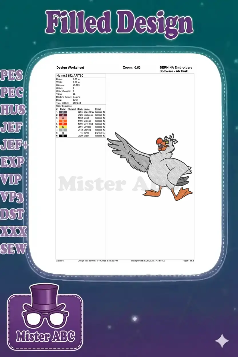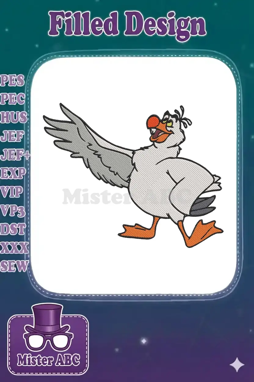 Capture the whimsical charm of Scuttle from The Little Mermaid with this vibrant embroidery design, perfect for fans!