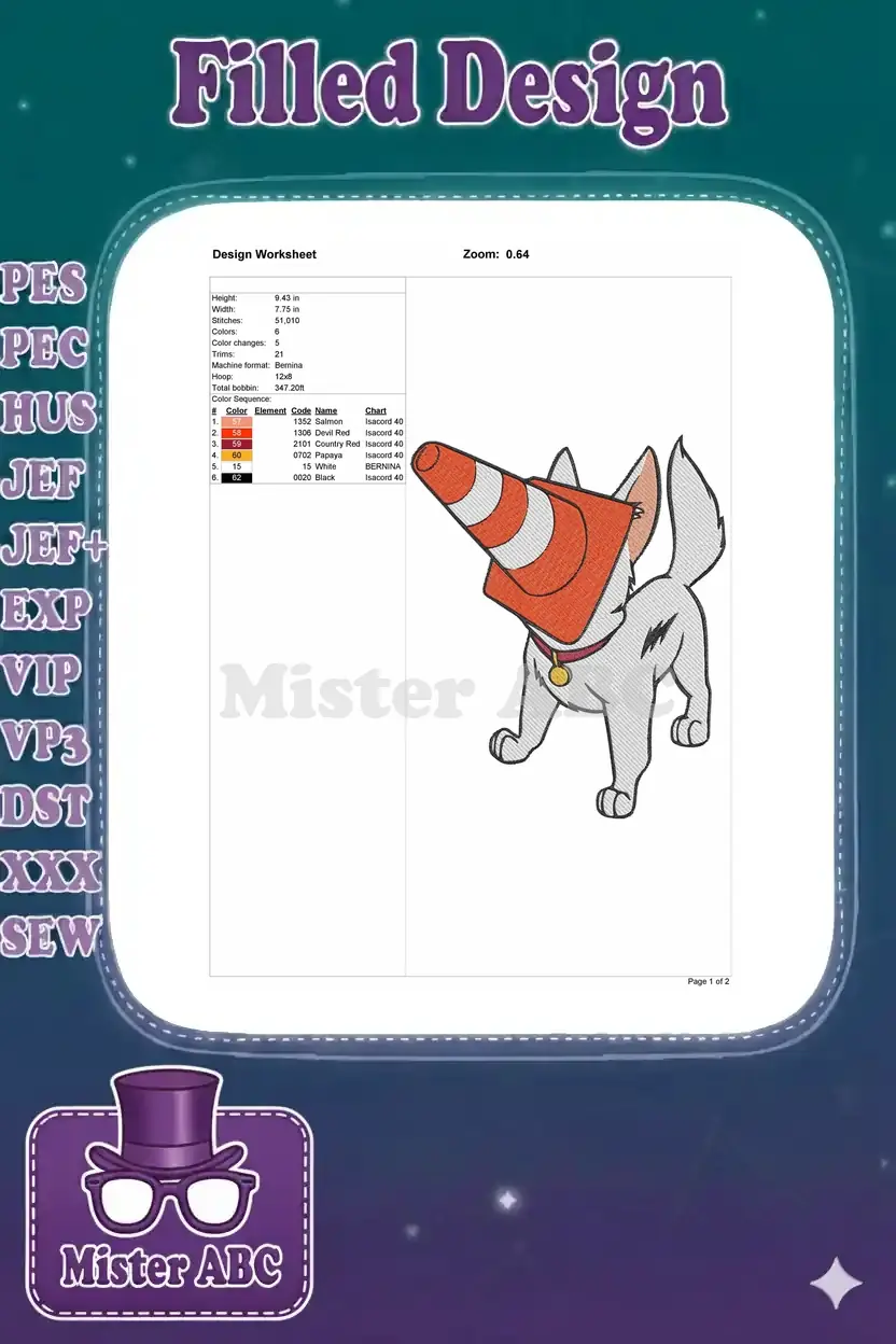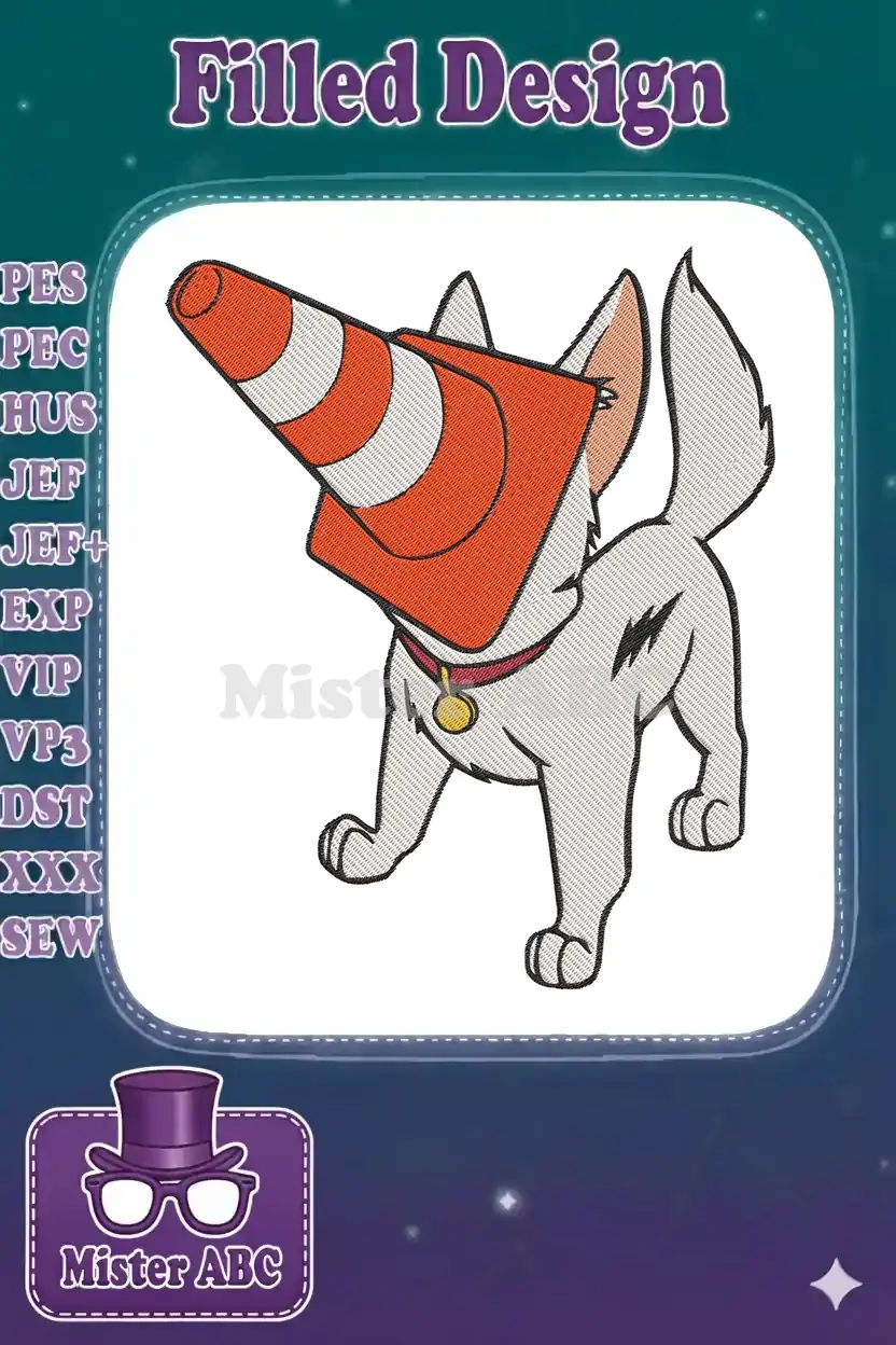 Capture the playful spirit of Bolt with this unique embroidery design featuring the beloved dog comically stuck with a traffic cone.