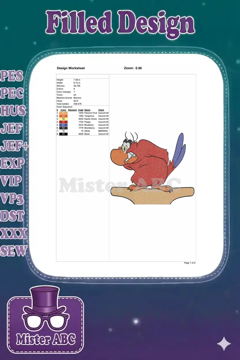 Furious Iago Disney Aladdin Red Parrot Embroidery Designs