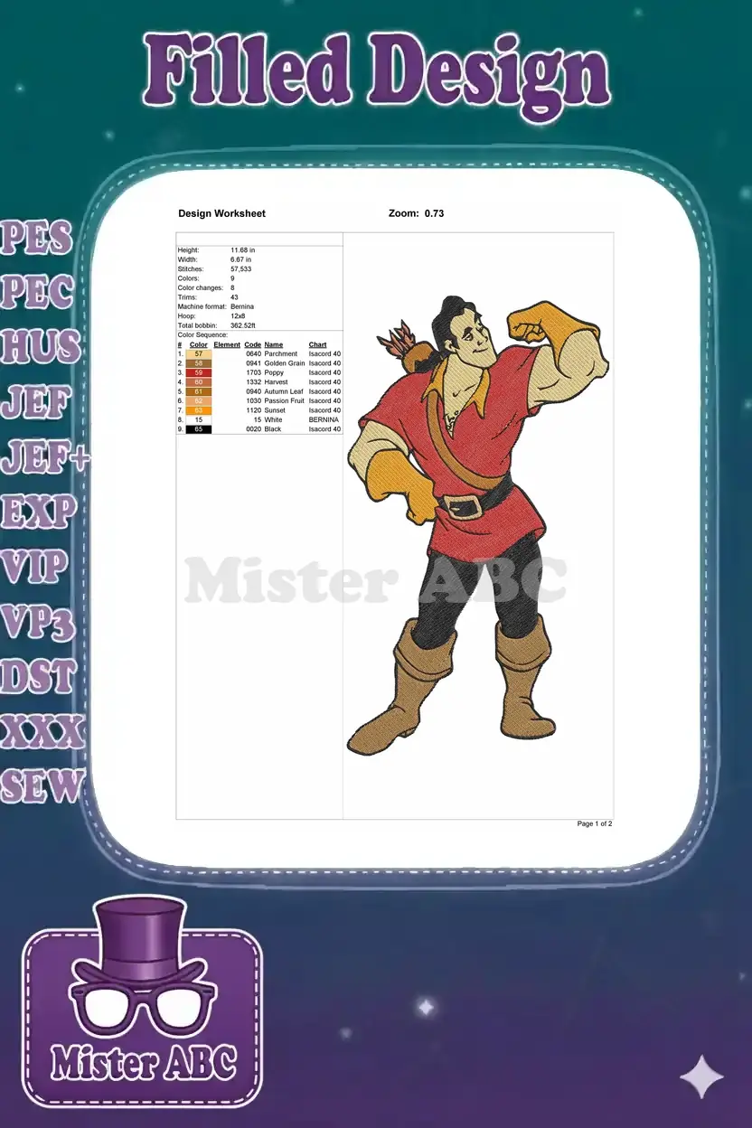 Gaston Disney character flexing bicep strong hunter embroidery designs