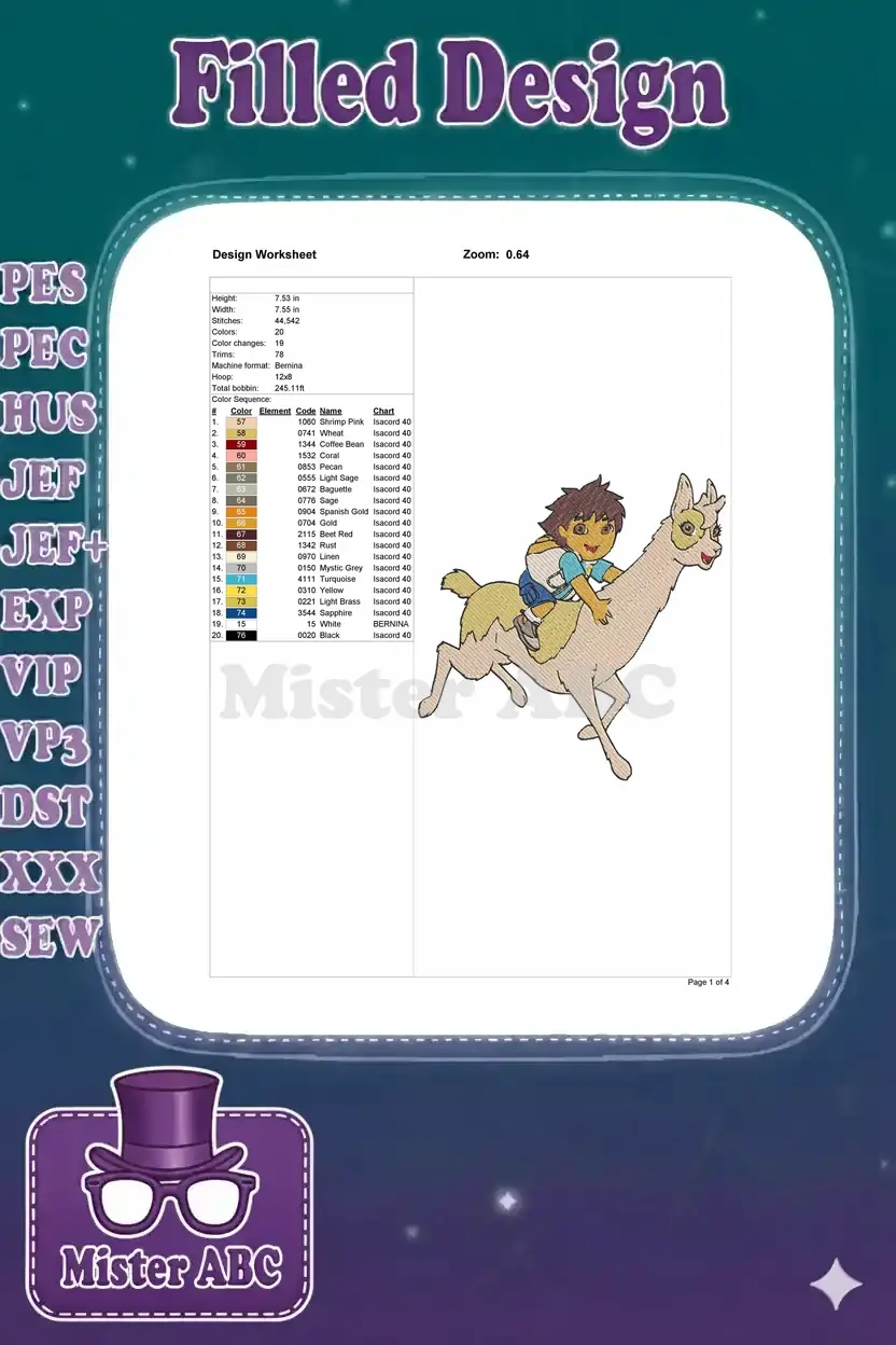 Go Diego Go Boy Riding Llama Cartoon Embroidery Designs