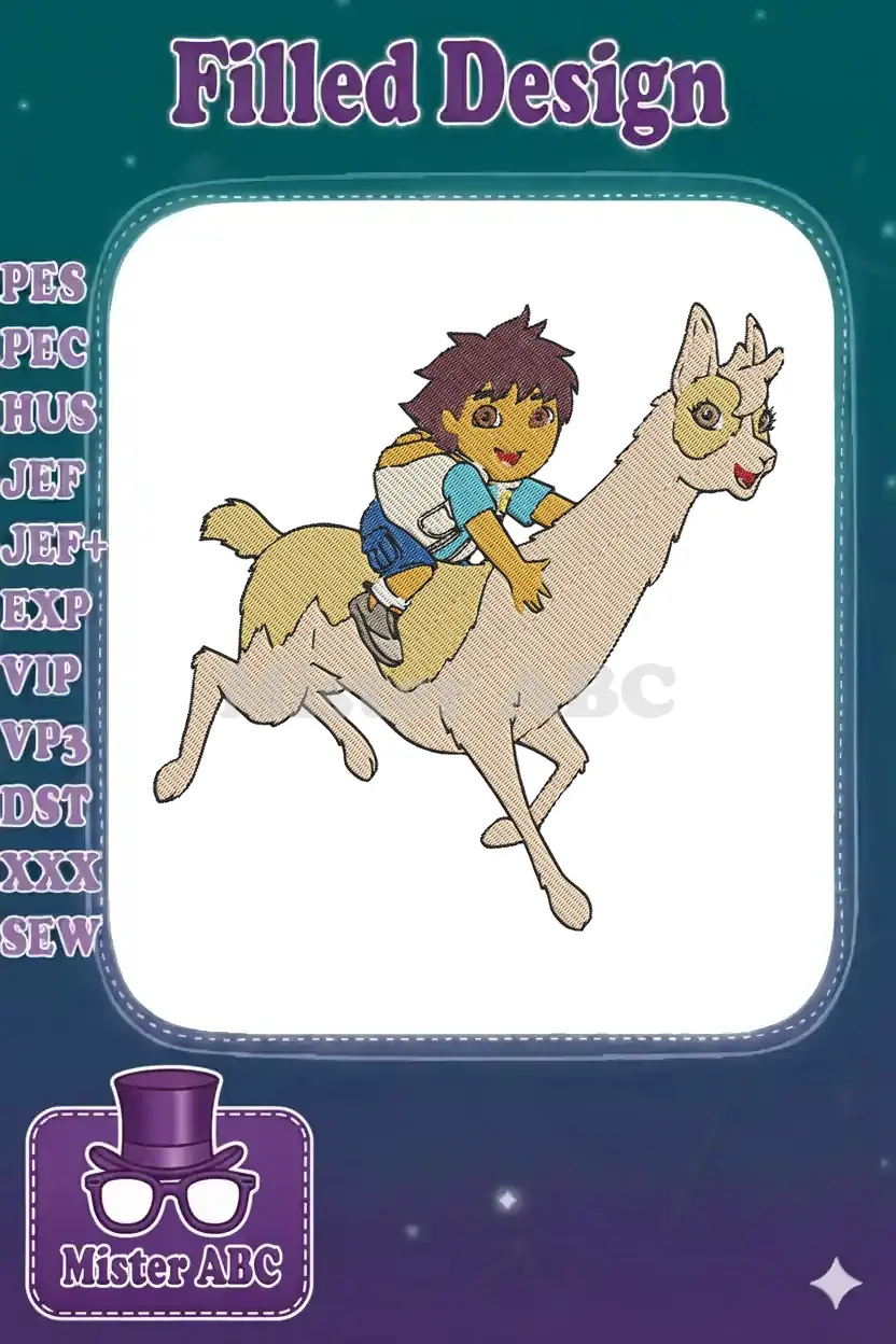 A delightful embroidery design capturing Diego on a llama, perfect for adding an adventurous and playful touch to children’s items.