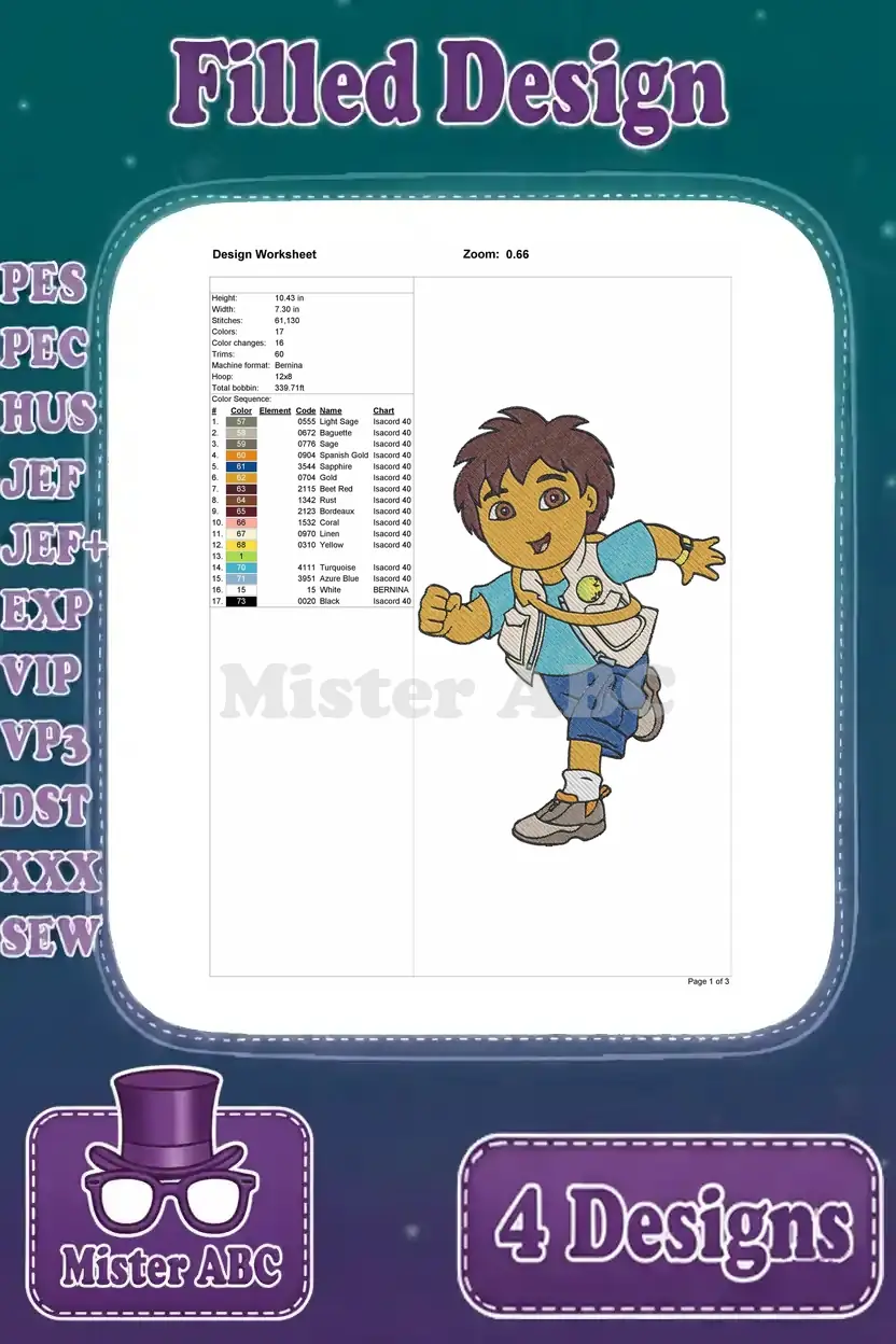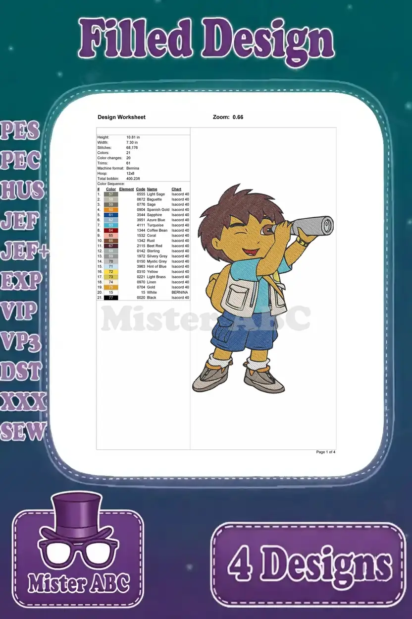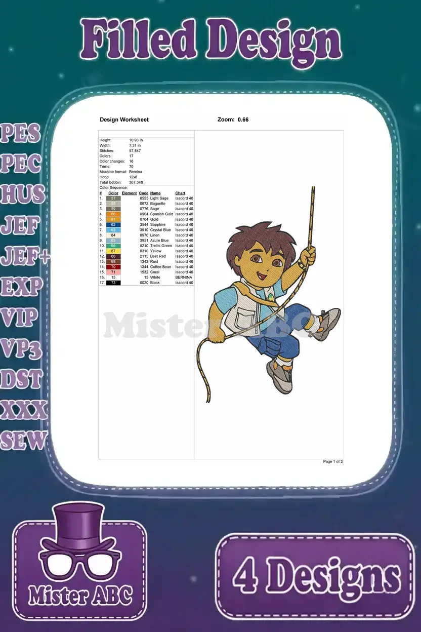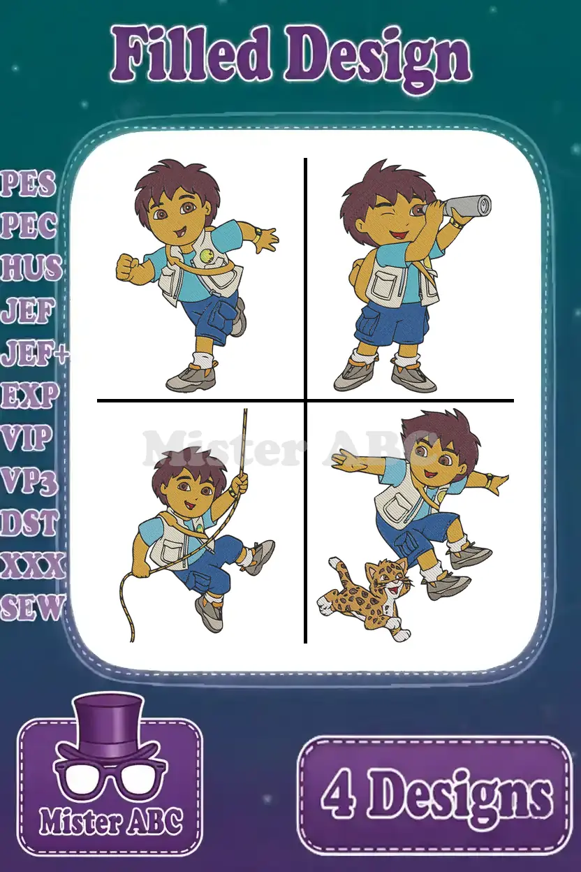 Go Diego Go Diego Marquez Action Poses With Rope Binoculars And Baby Jaguar – Filled Embroidery Design