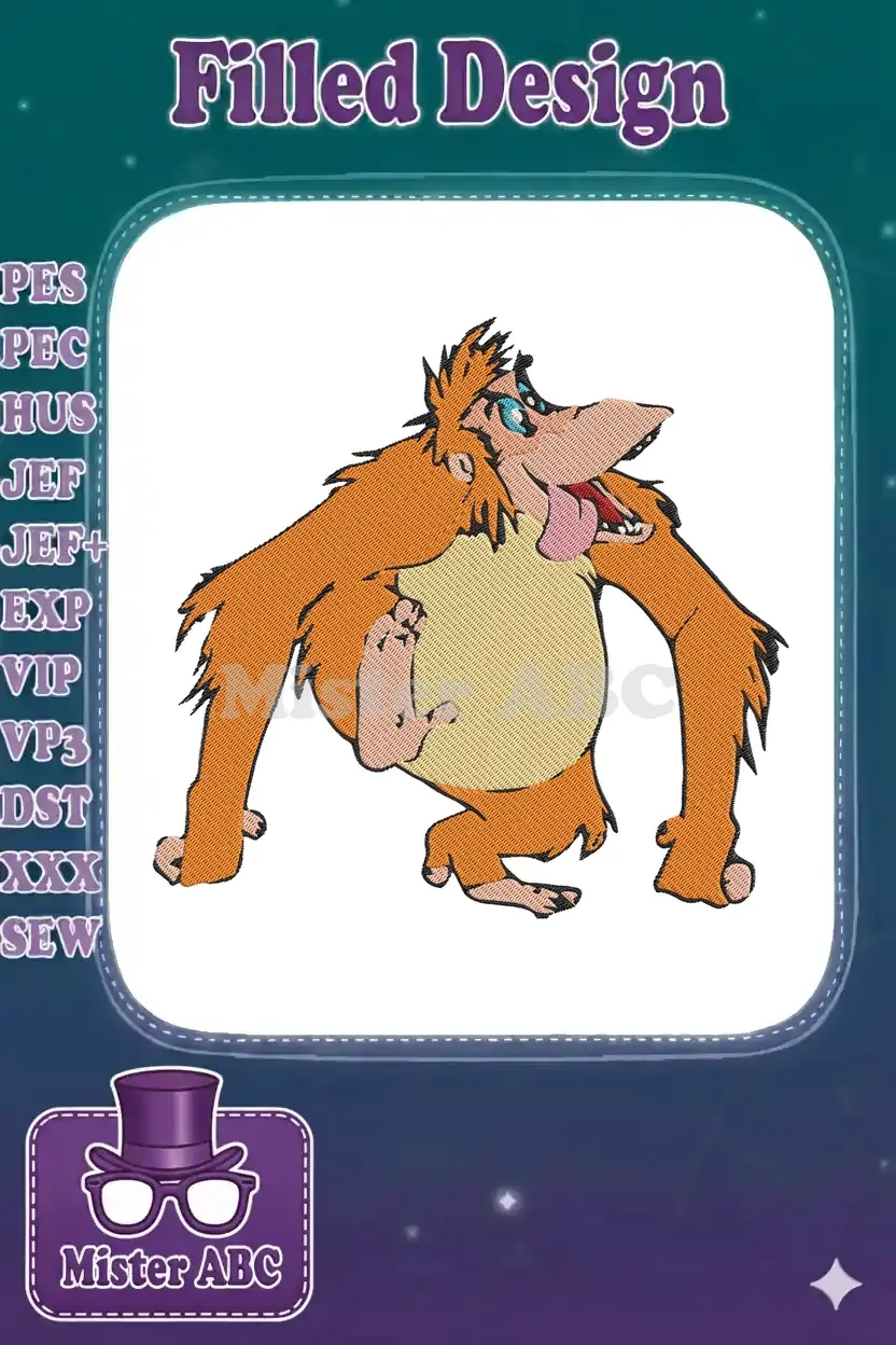 Swing into fun with this vibrant King Louie embroidery design! A playful ape, perfect for adding character to any project.