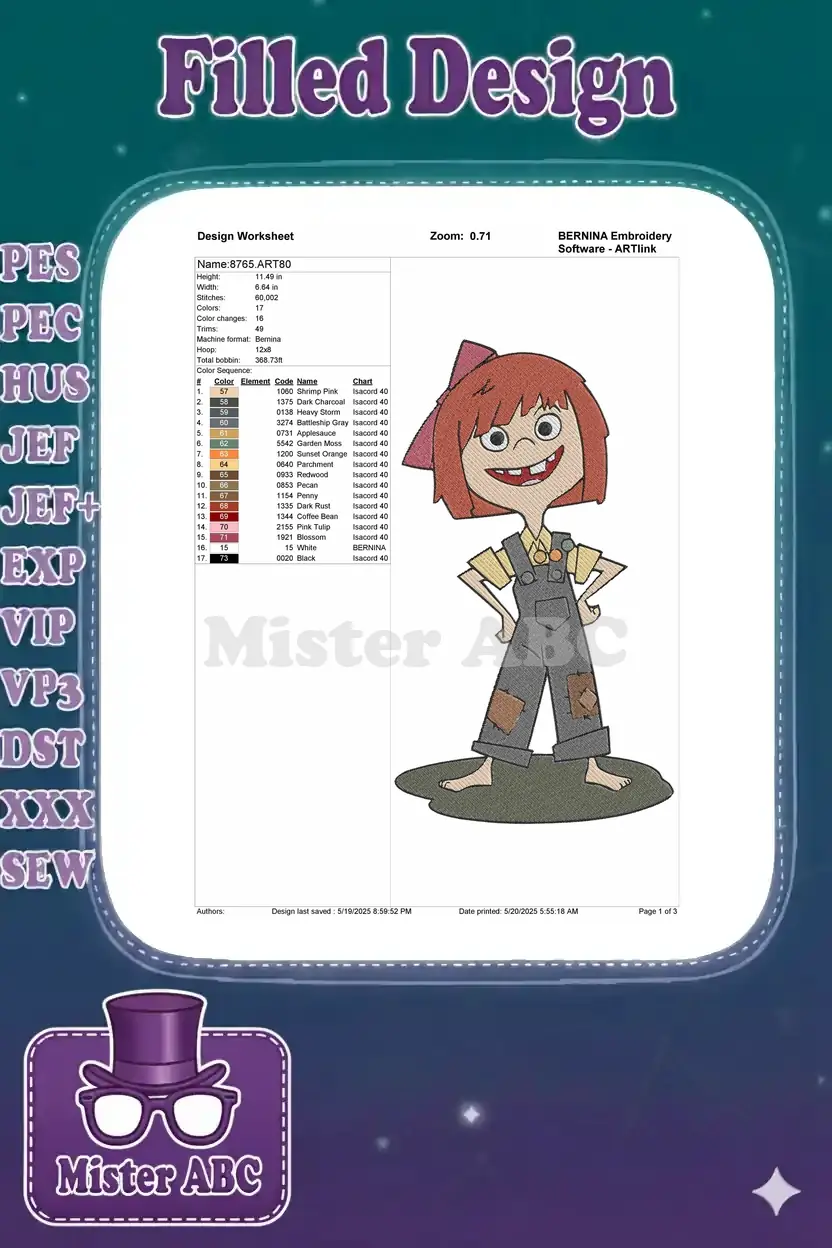 Vibrant embroidery design featuring a cheerful, red-haired character in patched overalls, adding playful charm to any item.