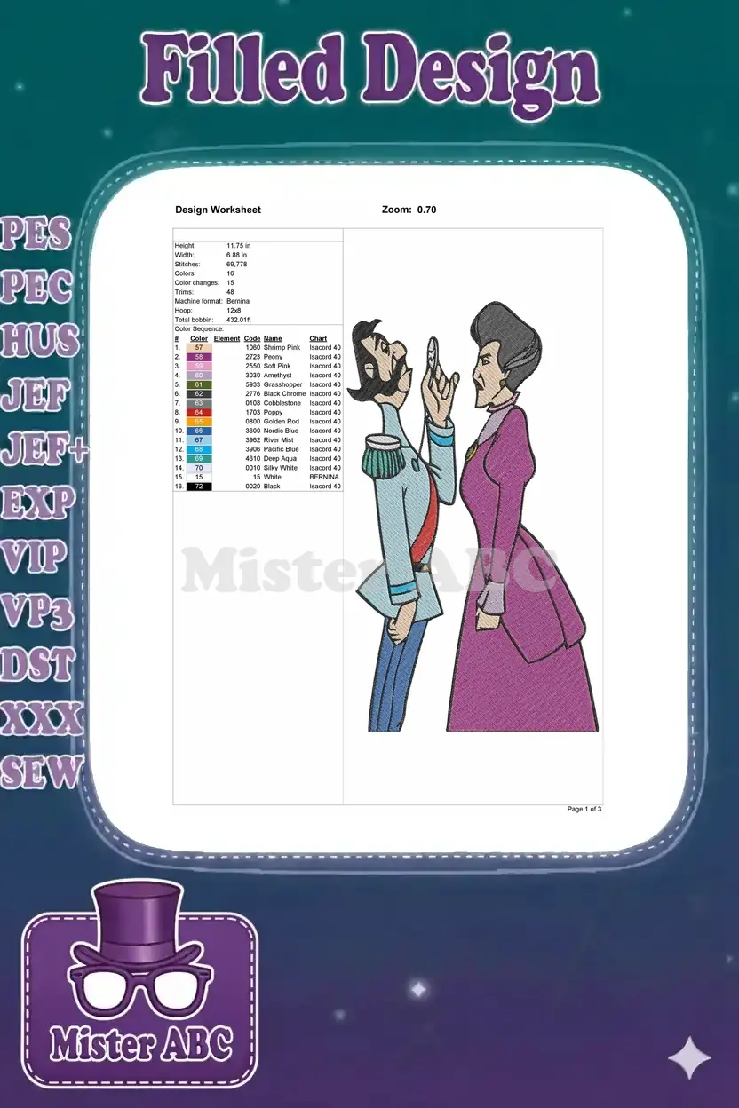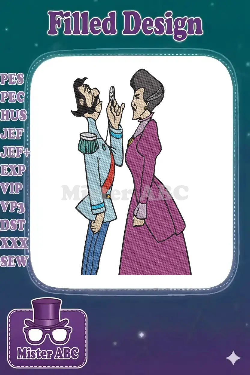 Relive classic Disney magic! Intricate embroidery of Lady Tremaine and Grand Duke from Cinderella. Perfect for fans.