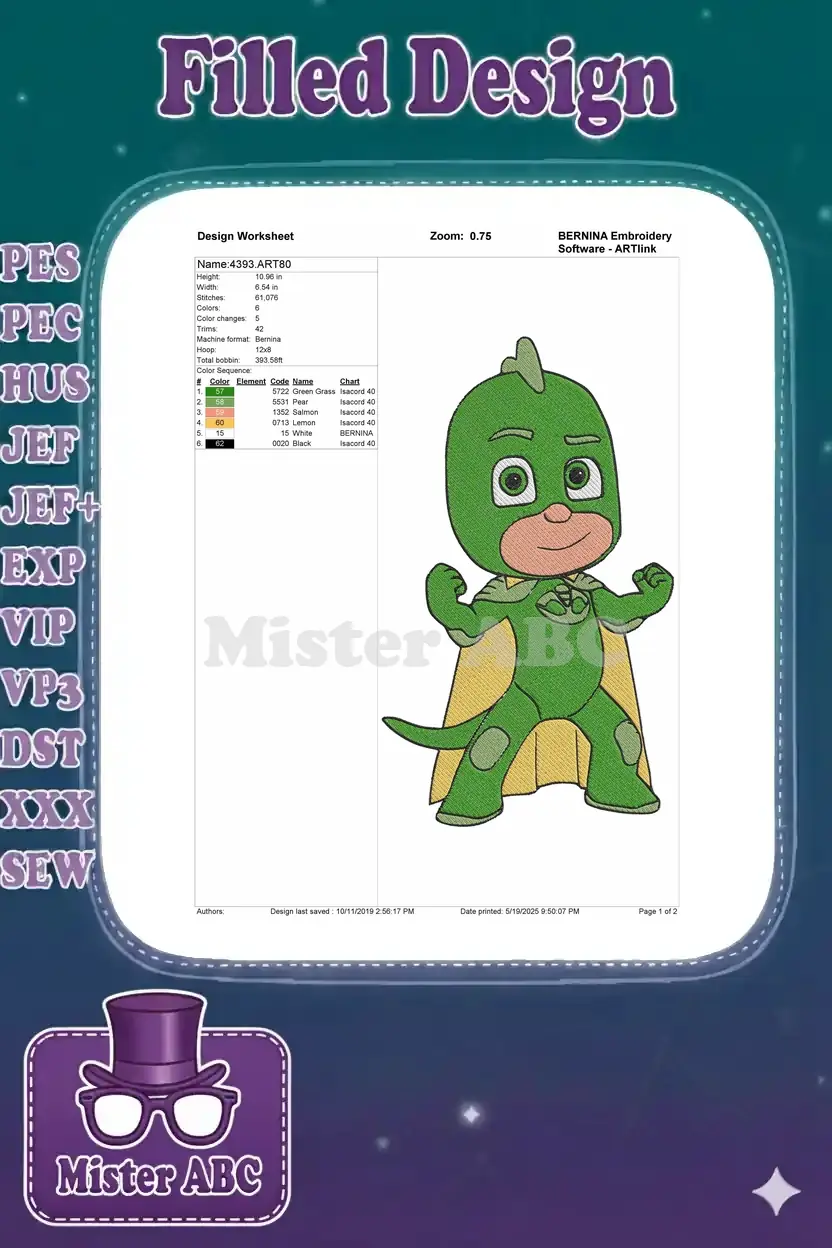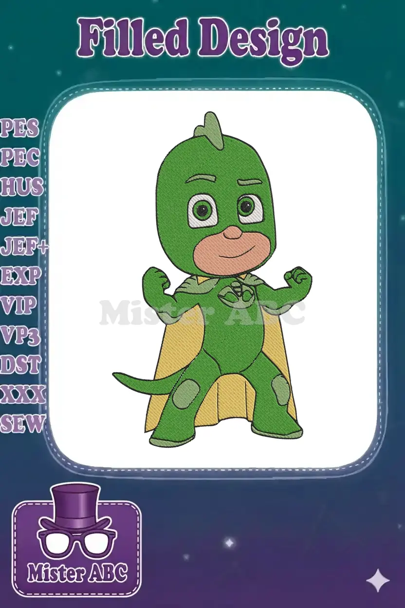 Green Gekko PJ Masks Cartoon Superhero Character Embroidery Designs