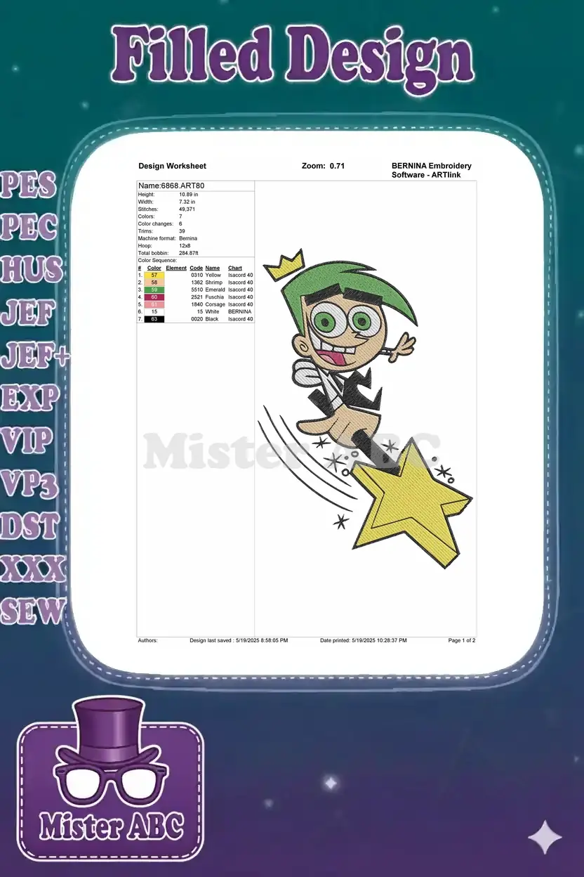 Whimsical Cosmo embroidery design captures the magical fairy godparent riding a sparkling star. Perfect for fans!