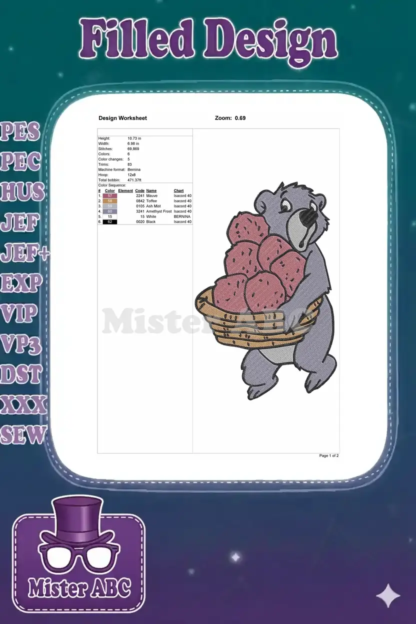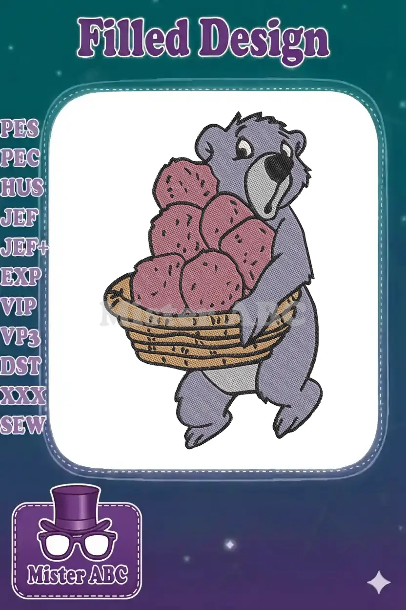 A delightful Baloo embroidery design, showcasing the beloved bear carrying a basket of delicious berries. Perfect for adding a touch of jungle charm to any project.