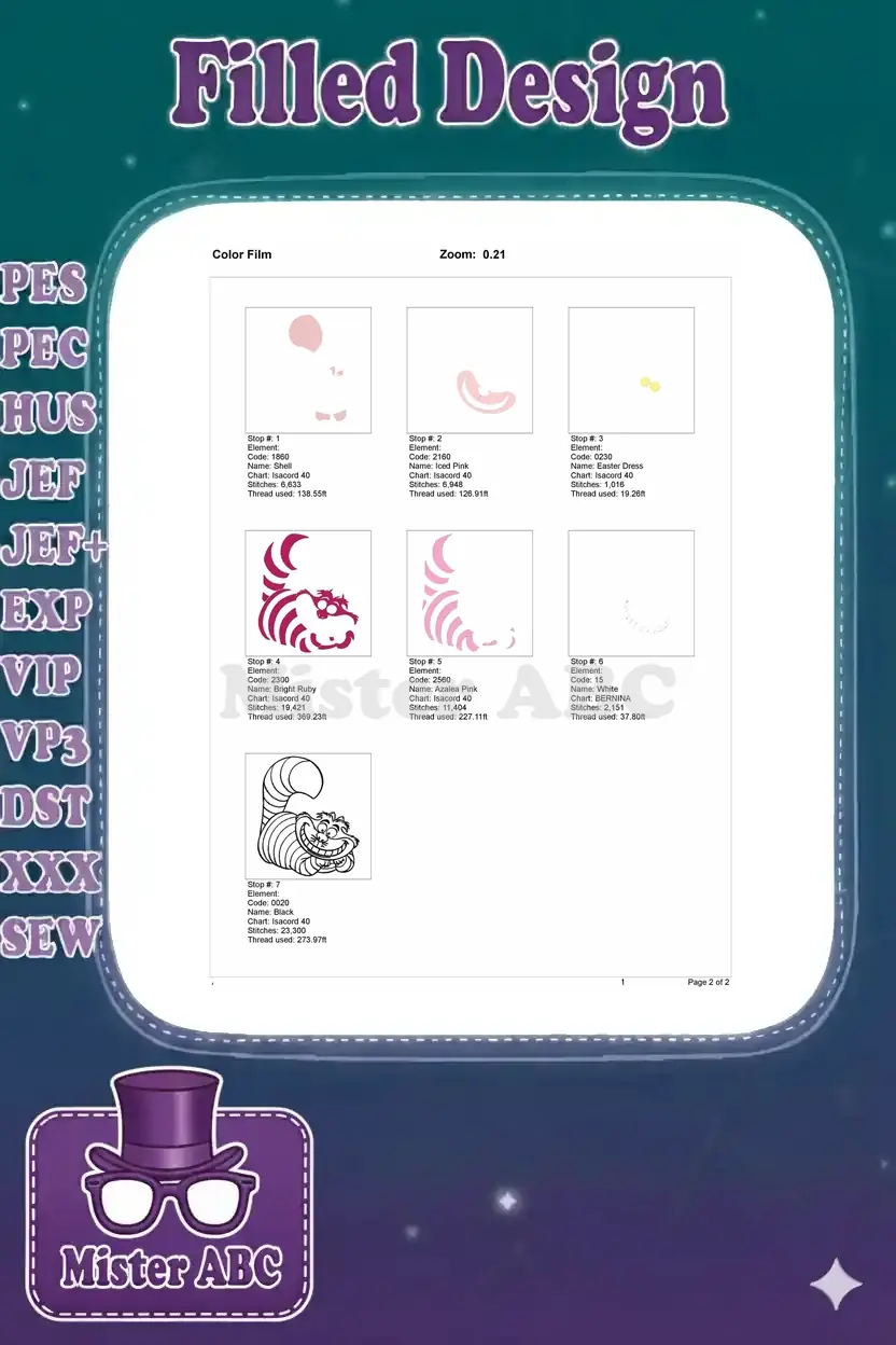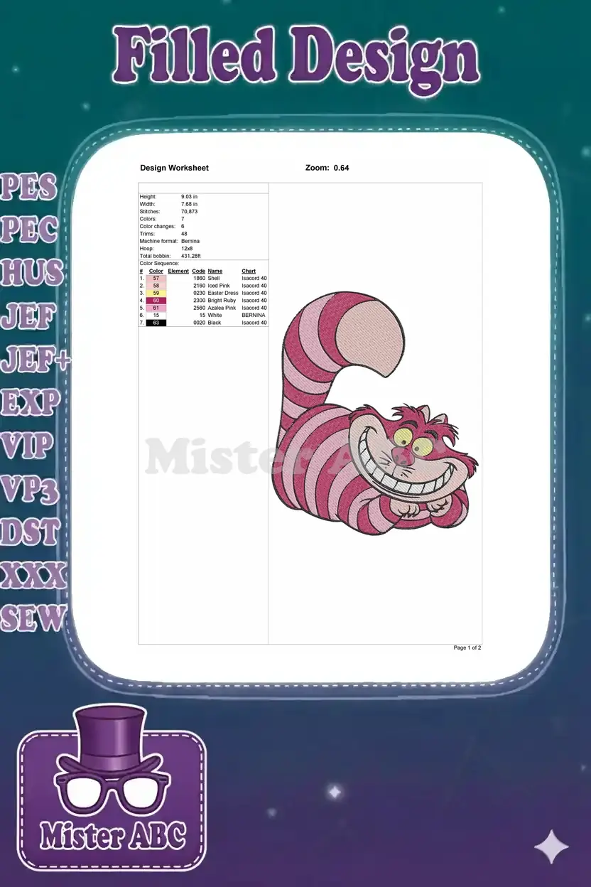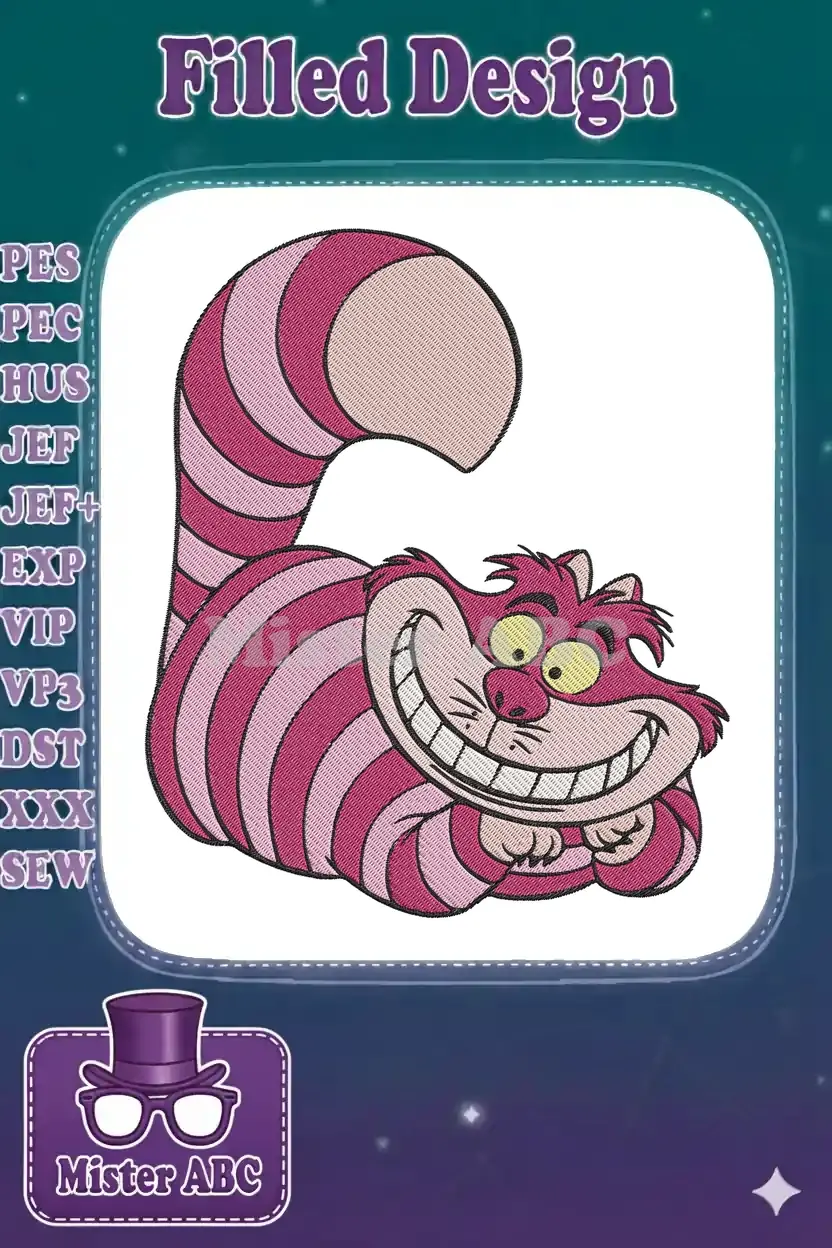 Grinning Cheshire Cat Pink Purple Striped Alice in Wonderland Embroidery Designs
