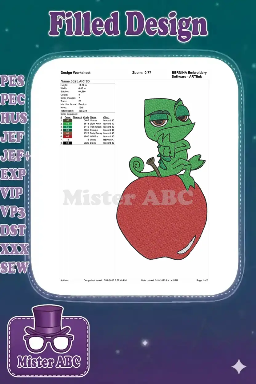 Grumpy green chameleon sitting on red apple embroidery designs
