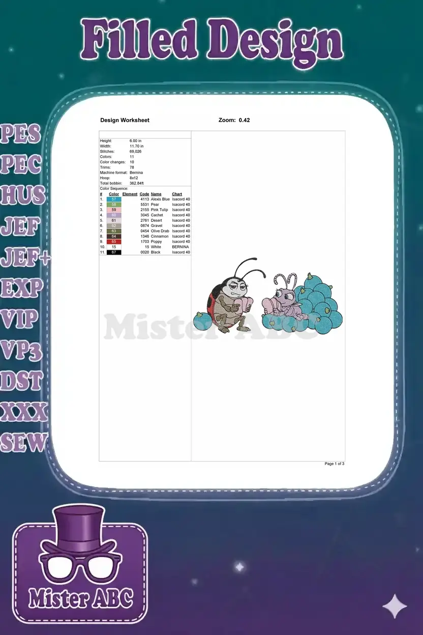 Bring animated charm to your projects with this delightful embroidery design featuring beloved insect characters!