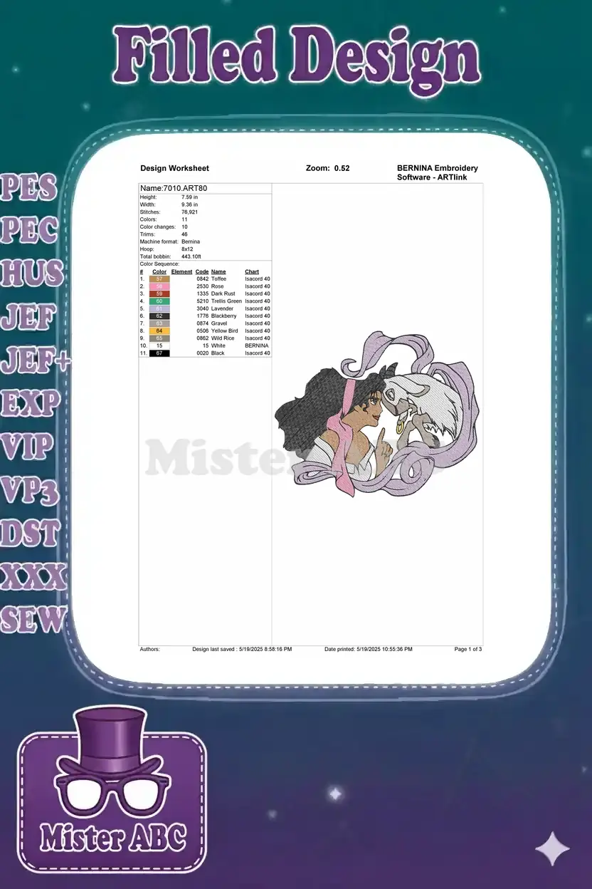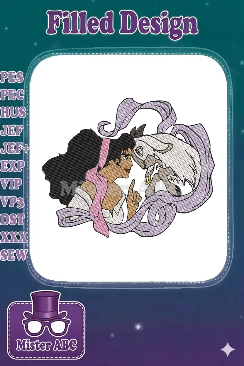 Celebrate the magic of Disney with this captivating Esmeralda and Djali embroidery design. Perfect for fans and crafters alike!