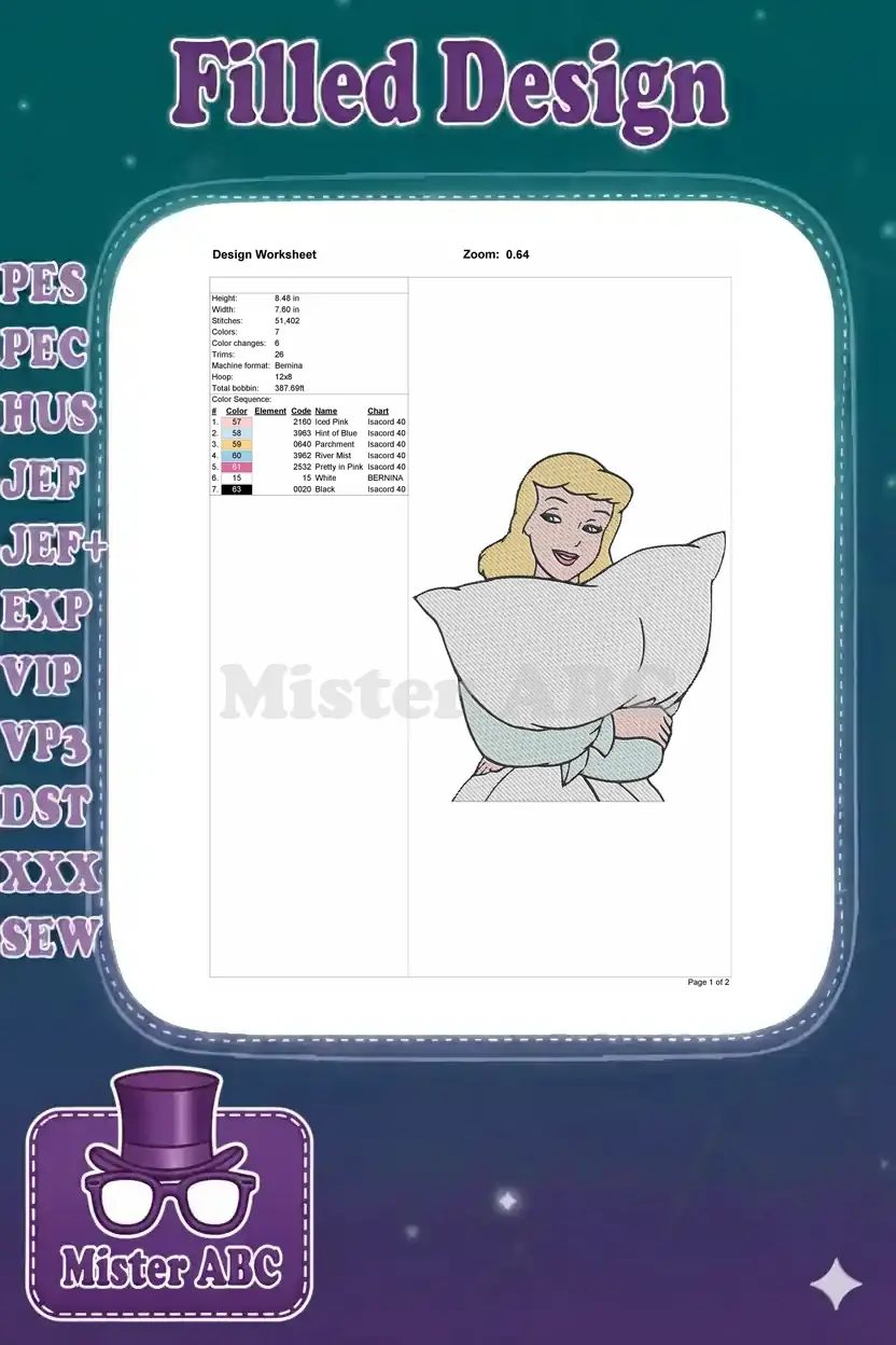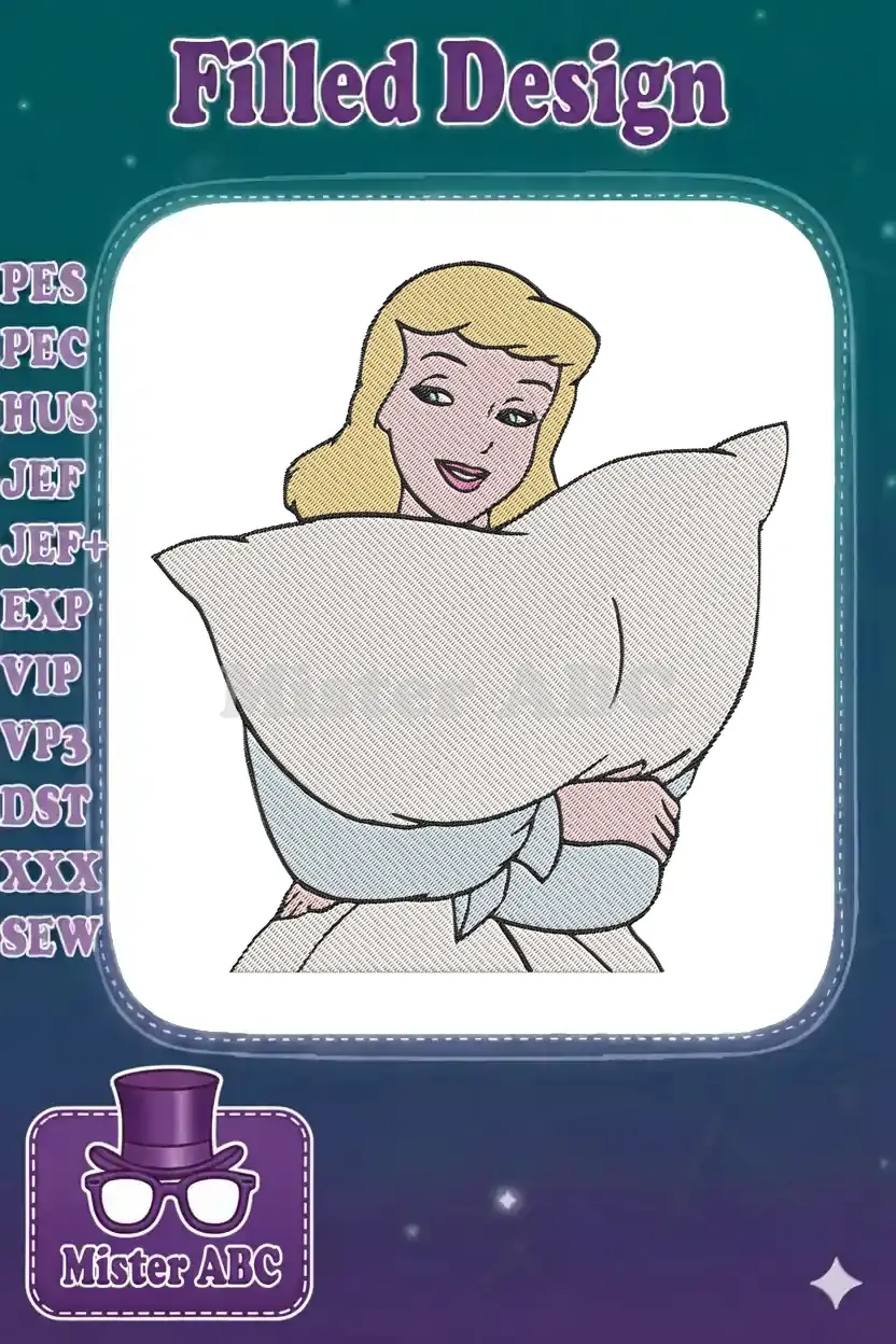 Happy blonde cartoon princess Cinderella holding pillow embroidery designs