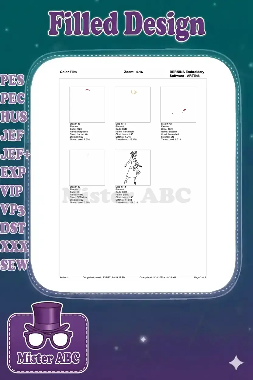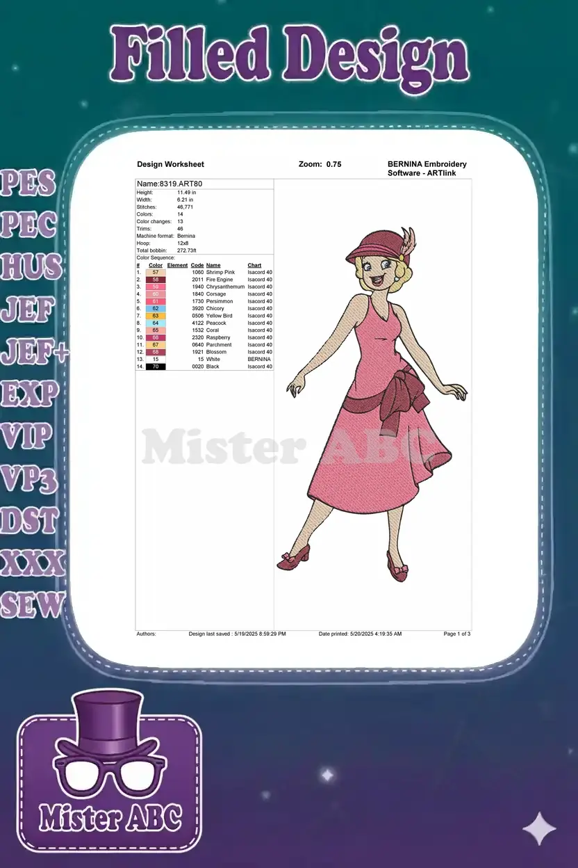 A lively flapper girl embroidery design, perfect for adding vintage charm to any project. Vibrant colors bring this energetic character to life!