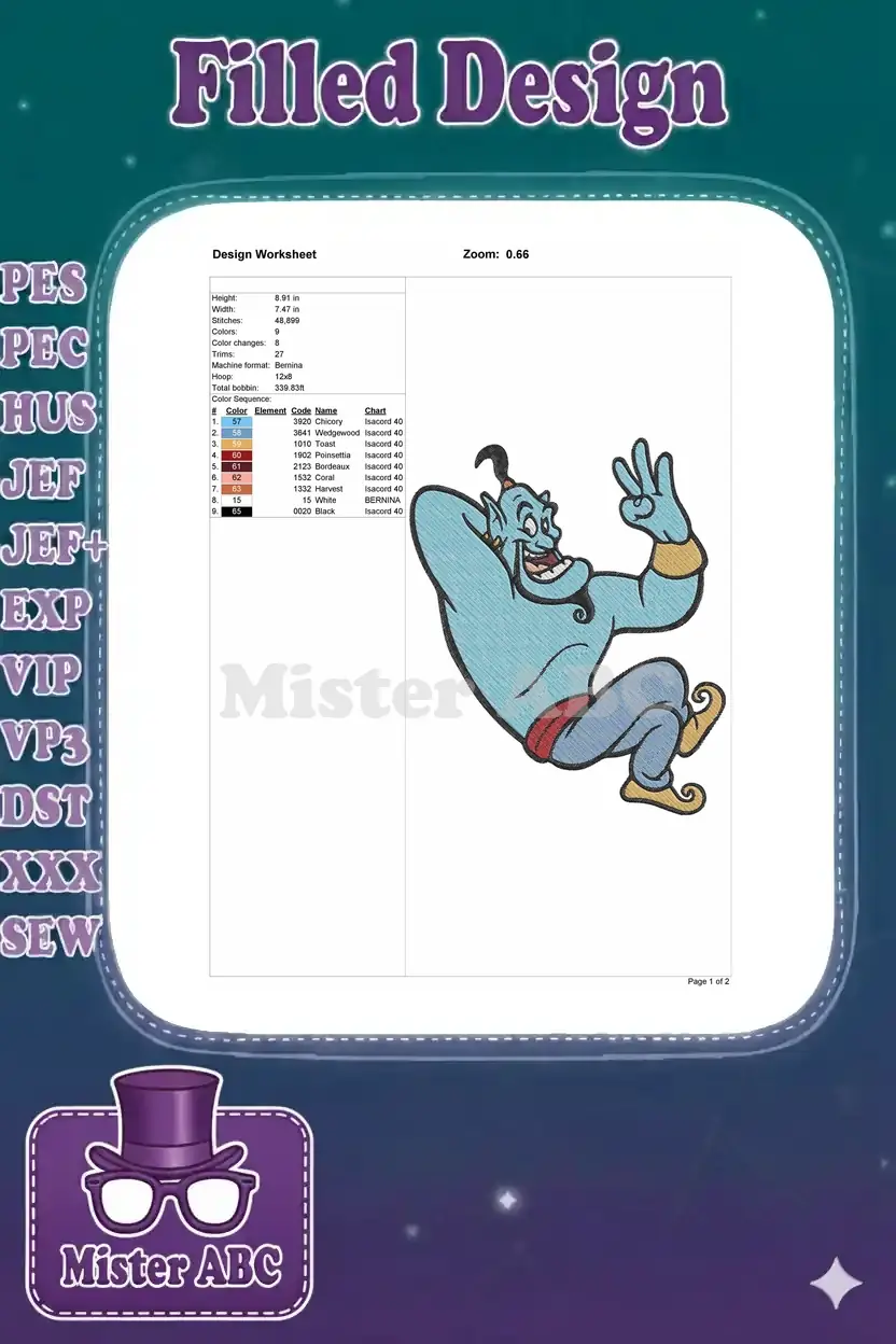 Happy Blue Genie Character Peace Sign Embroidery Designs
