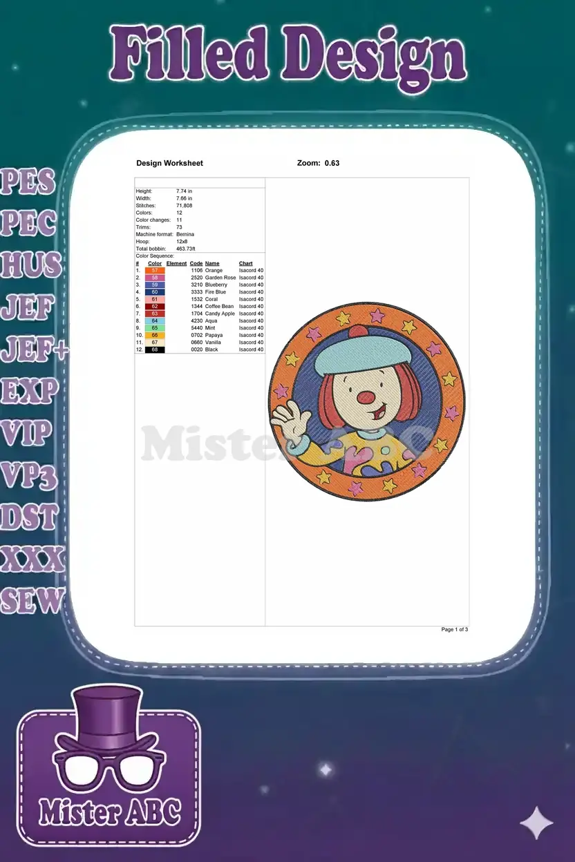 Happy cartoon clown character waving with stars embroidery designs