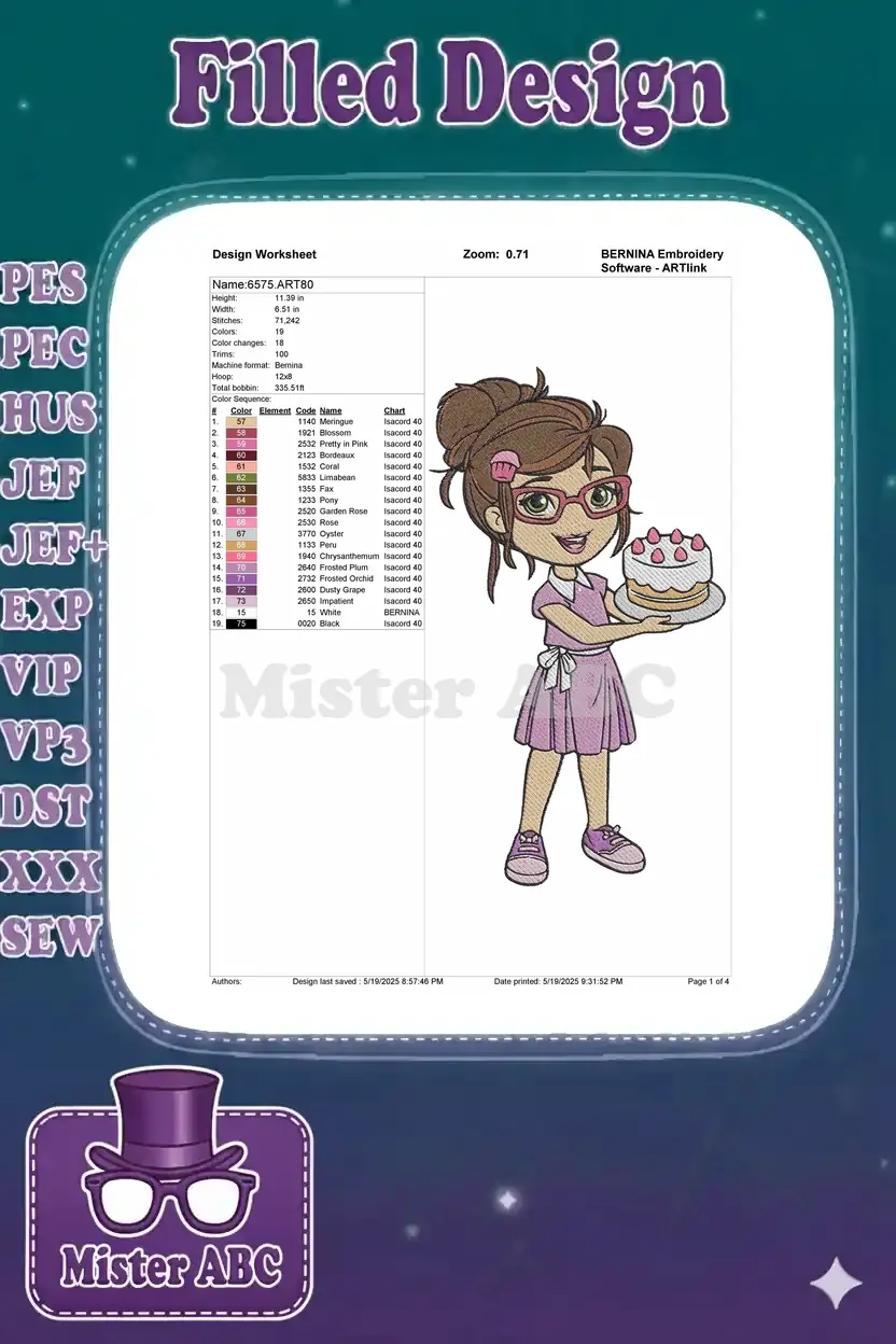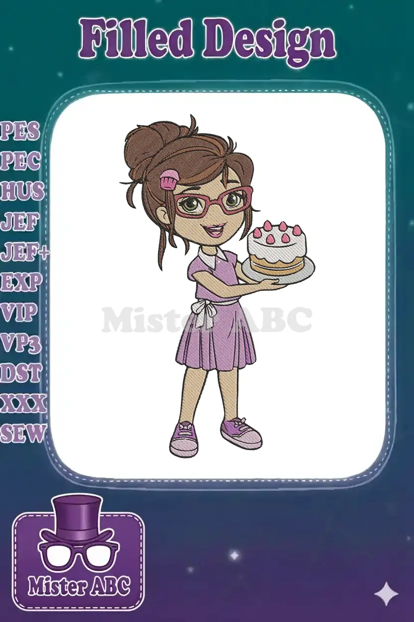 An adorable machine embroidery design featuring a cheerful baker girl holding a delicious strawberry cake, perfect for any celebration or gift!