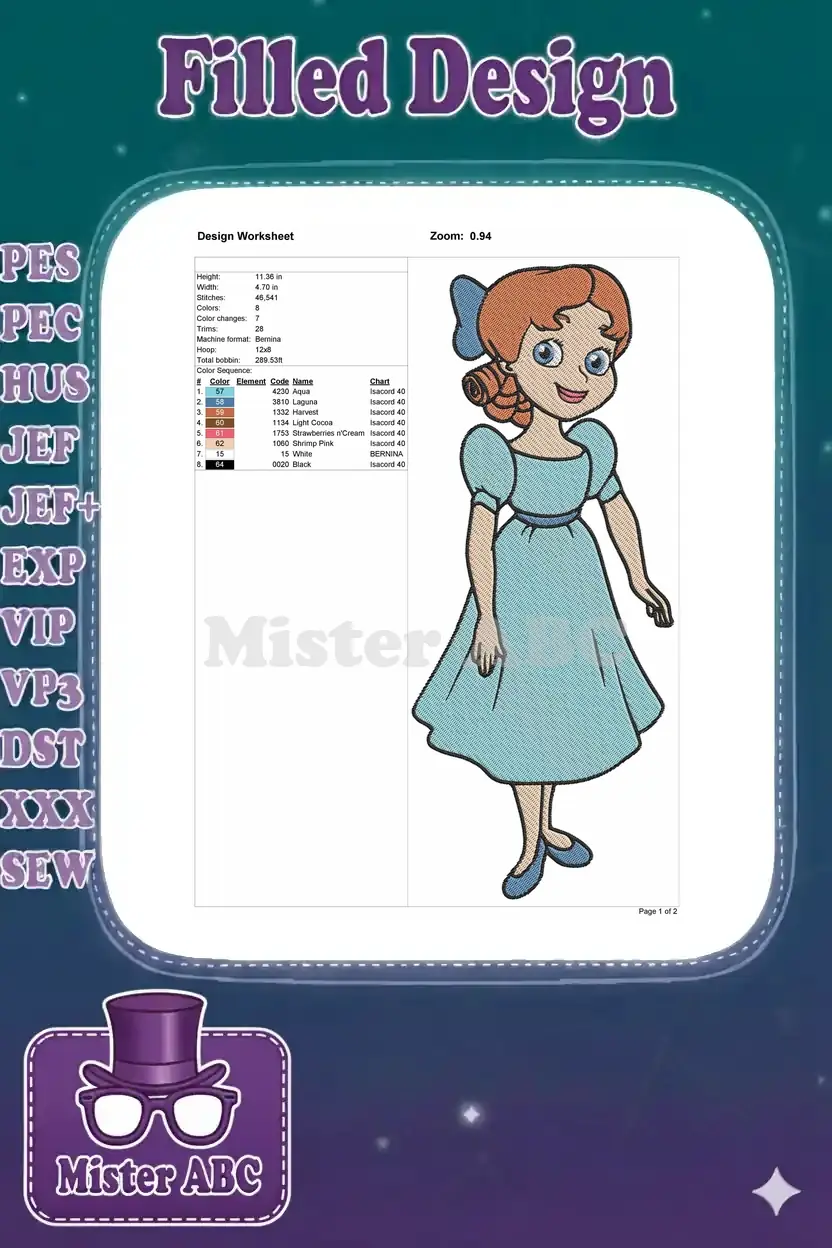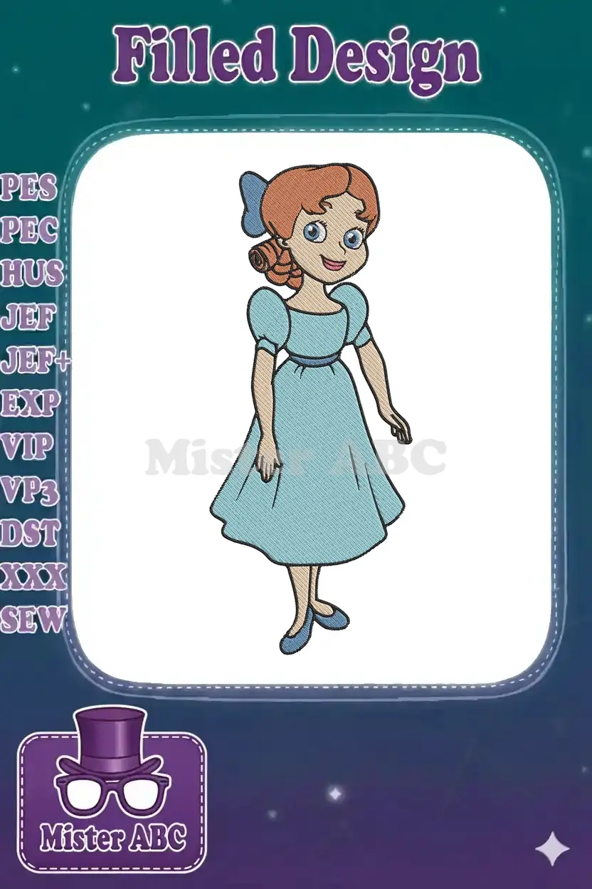 Charming Wendy Darling embroidery design, perfect for adding a touch of classic fairy tale magic to any project. Delightful fill stitch detail.