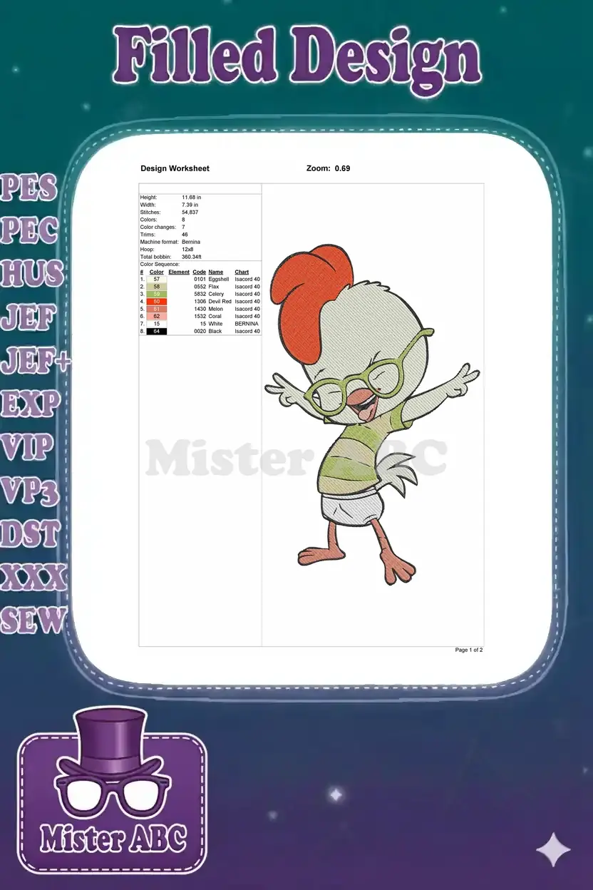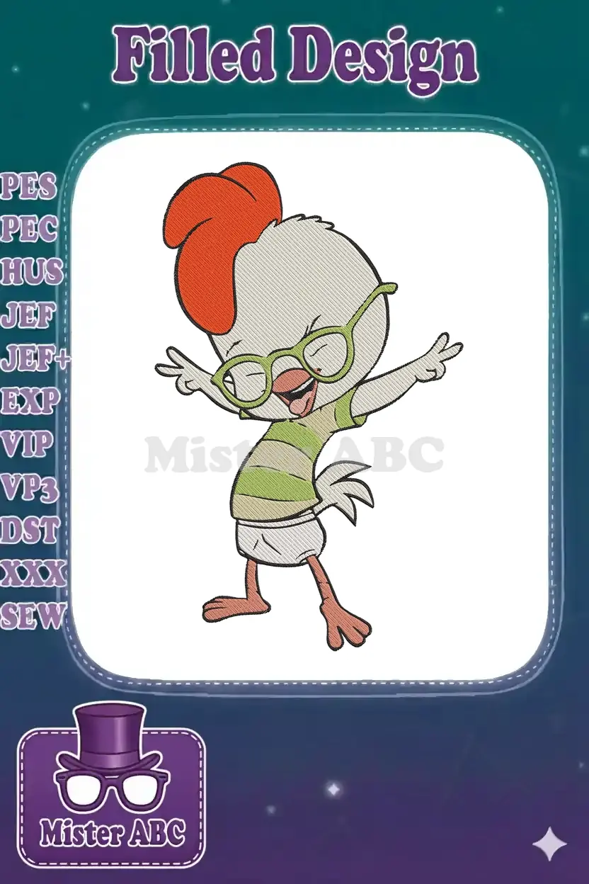 Happy Chicken Little wearing glasses cartoon character embroidery designs