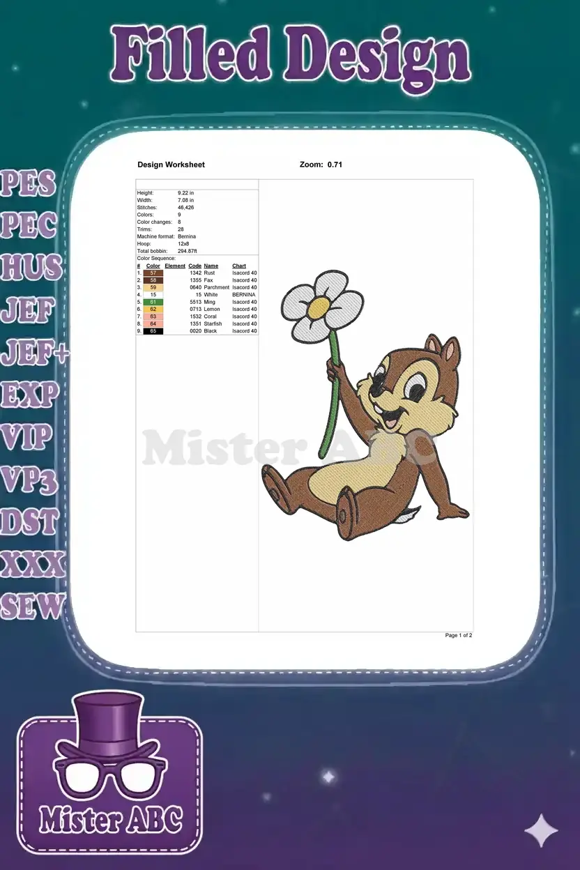 Adorable Dale embroidery design, perfect for adding a cheerful, playful touch to any item. High-quality, vibrant stitches.
