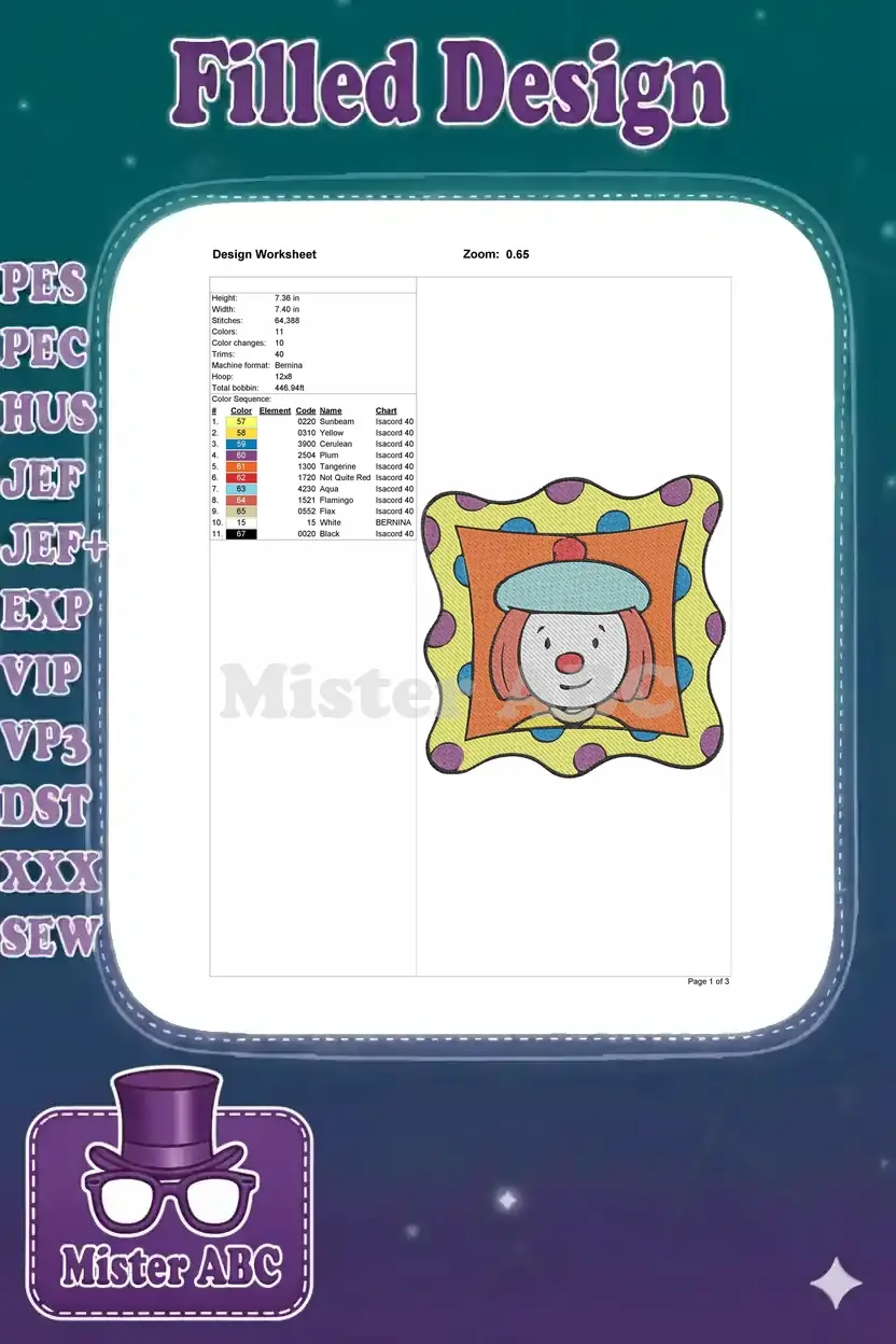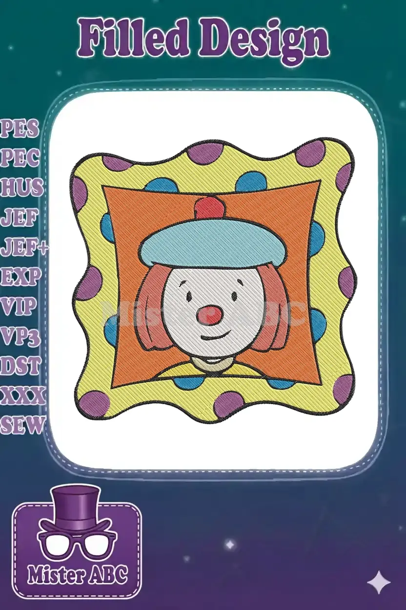 Happy Clown Face Blue Beret Polka Dot Border Embroidery Designs