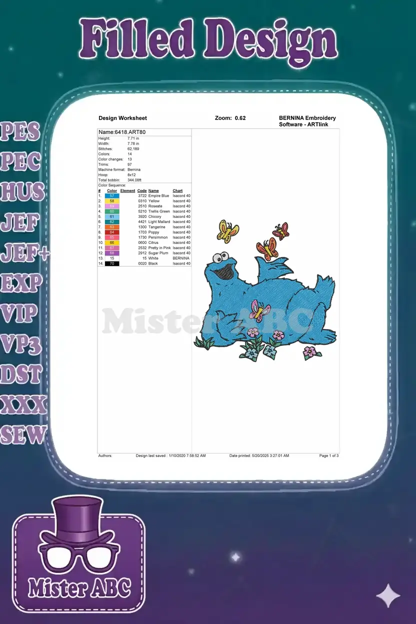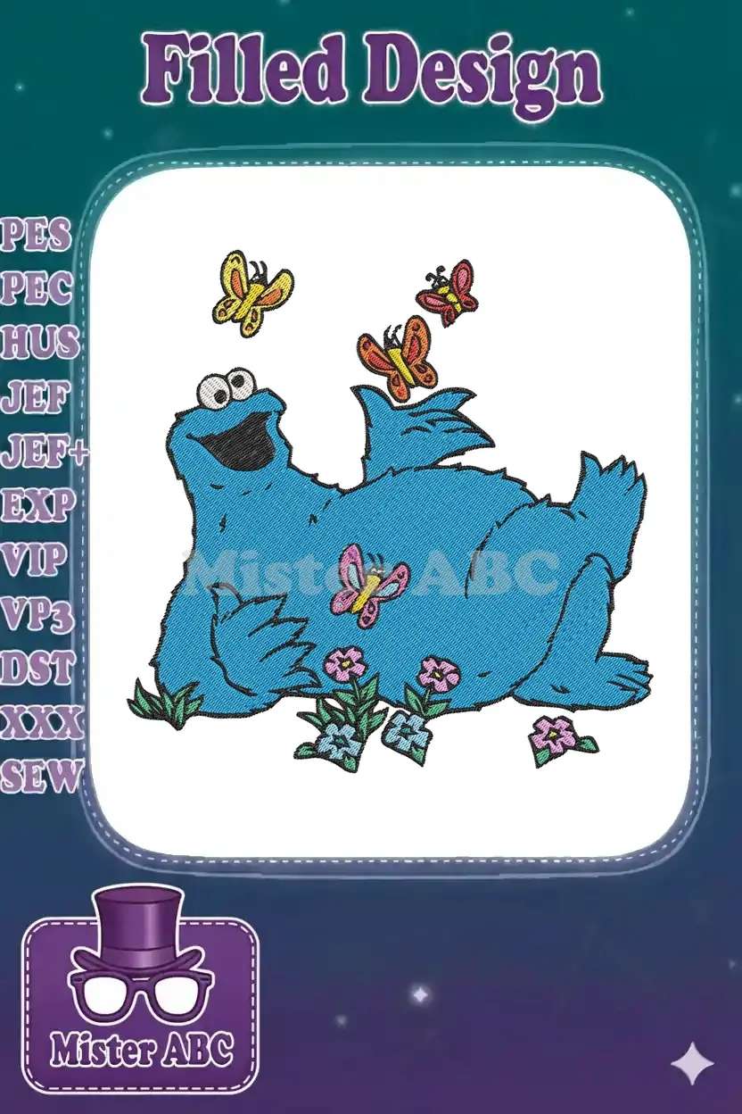 Happy Cookie Monster with Butterflies and Flowers Embroidery Designs