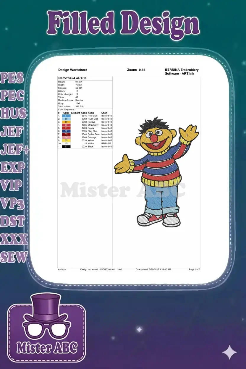 Happy Ernie Sesame Street Character Striped Sweater Waving Embroidery Designs