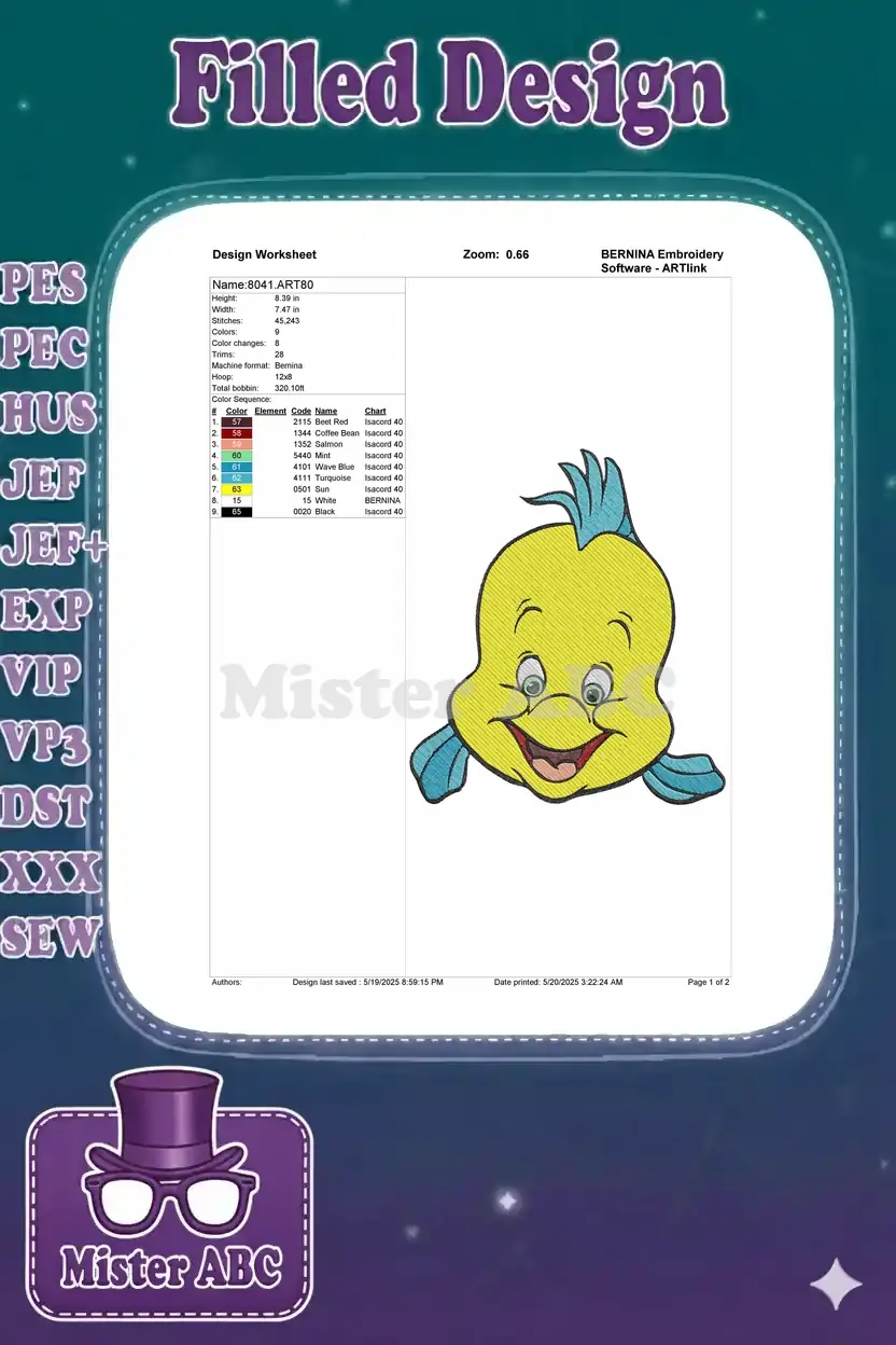 Bring the magic of the ocean to your projects with this delightful Flounder embroidery design! Perfect for fans.