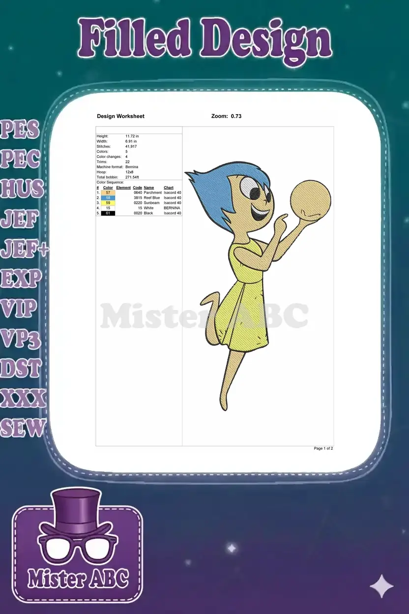 Happy Joy character from Disney Pixar Inside Out embroidery designs